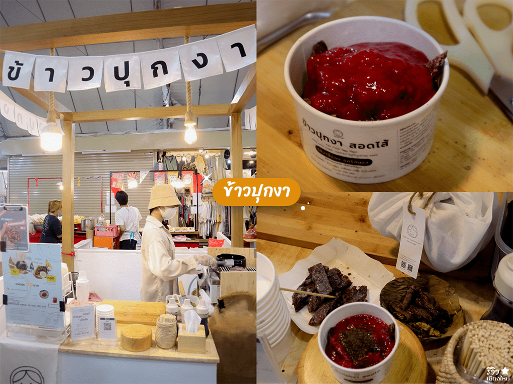 ข้าวปุก เป็นขนมพื้นบ้านที่หาทานได้แแค่ภาคเหนือ หน้าร้านจะมีข้าวปุกงาปิ้งและทอด มีให้เลือกทั้งแบบสอดใส้น้ำตาลอ้อยหรือจะโรยด้วยน้ำตาลอ้อย ในส่วนท้อปปิ้งจะมีนมข้นช็อกโกแลต น้ำอ้อย น้ำผึ้ง แยมสตอโฮมเมด นอกจากนี้เค้ายังมีมีแพคเกจของฝากเป็นแพคให้กลับไปปิ้งเองที่บ้านด้วยย