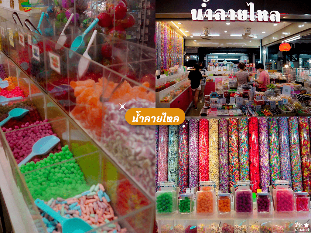 ร้านนี้คือมองตั้งแต่ทางเข้ากาดก็เห็นเพราะร้านสีสันเด่นสุด เป็นร้านขายเยลลี่ขนมหวาน ลูกอมต่างๆ มีให้เลือกเยอะม้ากก นอกจากเยลลี่แล้วยังมีขายขนม ผลไม้แช่อิ่ม ผลไม้เชื่อ และอื่นๆ อีกด้วย