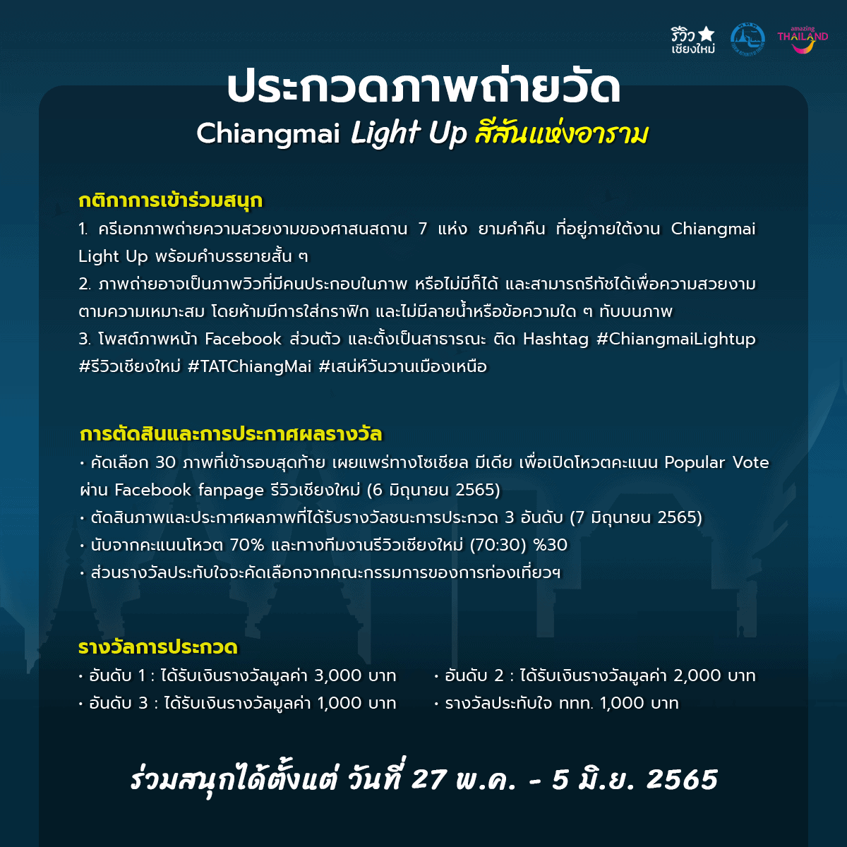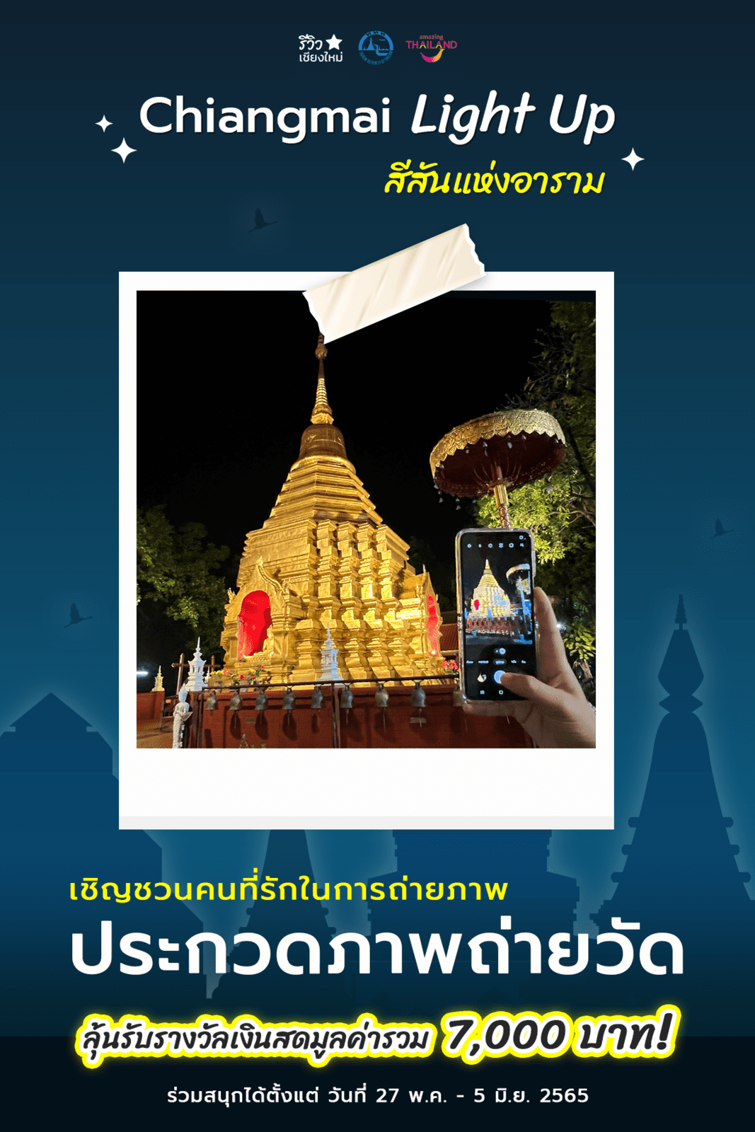 การท่องเที่ยวแห่งประเทศไทย (ททท.) สำนักงานจังหวัดเชียงใหม่ จับมือกับรีวิวเชียงใหม่ จัดทำ Campaign ประกวดถ่ายภาพ ในหัวข้อ “Chiangmai Light Up สีสันแห่งอาราม” ภายใต้งาน เชียงใหม่ Light Up ชม ช็อป แชะ @ประตูท่าแพ เพื่อส่งเสริมศักยภาพแหล่งท่องเที่ยวด้านศาสนสถานในจังหวัดเชียงใหม่ และเพื่อส่งต่อเรื่องราวความประทับใจของนักท่องเทียวและบุคคลทั่วไป เพื่อชิงเงินรางวัล พร้อมรางวัลสุดพิเศษจากการท่องเที่ยวแห่งประเทศไทย