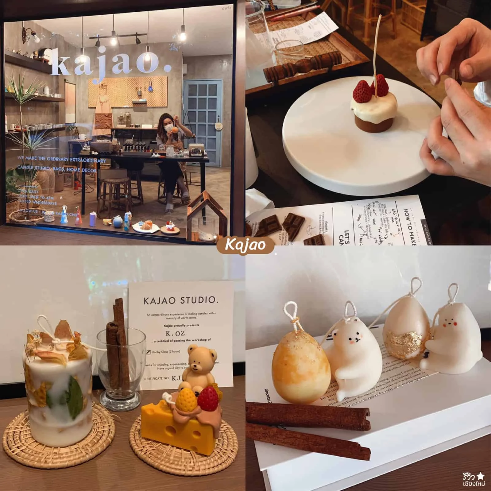ร้าน Kajao Studio สำหรับใครที่อยากมาทำกิจกรรมที่น่าจดจำกับคนรัก หรือเพื่อนๆ ที่นี่คือตอบโจทย์ เพราะได้ทั้งทำ workshop เทียนหอมแล้ว ยังได้เทียนหอมกลับไปจุดหอมๆ ที่บ้านเองด้วยย หรือใครที่อยากได้เทียนหอมกลับบ้าน มาเลือกกลิ่นเองได้เลยจ้าว แต่ละอันคือน่ารักปุ้กปิ้กมาก ได้ของตกแต่งบ้านเพิ่ม แถมยังเป็นพร็อบถ่ายรูปได้ด้วยย