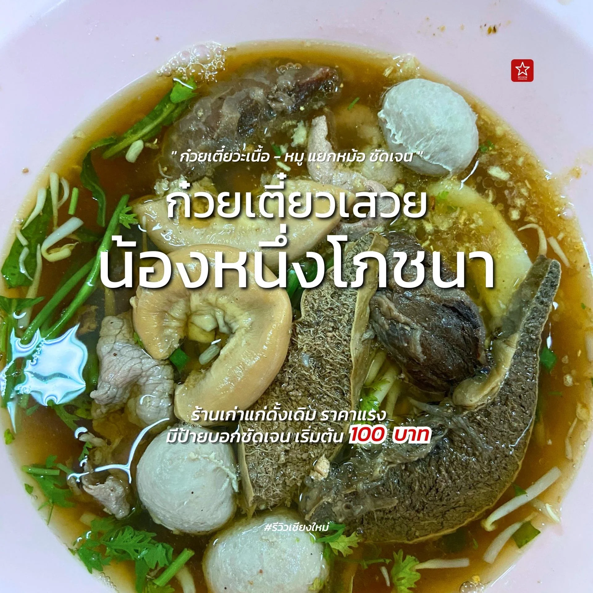 ก๋วยเตี๋ยวเสวย น้องหนึ่งโภชนา เป็นร้านก๋วยเตี๋ยวเก่าแก่ดั้งเดิม ที่ราคาออกตัวแรงเริ่มต้นชามละ 100 บาท มีก๋วยเตี๋ยวทั้งหมูและเนื้อแยก เค้าแยหม้อกันชัดเจนคนละโซนเลย ลูกชิ้นอร่อยเนื้อแน่น ลวกเส้นมาจังหวะพอดี น้ำซุปมีกลิ่นเครื่องเทศ ในชามจะใส่พริกน้ำส้มมาในน้ำซุปก๋วยเตี๋ยวด้วย ที่นี่ขวดผงชูรสวางอยู่ข้างๆ เครื่องปรุงบนโต๊ะคือว่าเอาแล้วแต่ชอบที่จะใส่ไม่ใส่ เนื้อเปื่อยตุ๋นมาอร่อย เครื่องในสไลด์ ลวกได้มาสุกพอดี