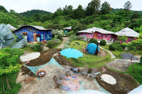 จากจุดเริ่มต้นที่เพียงแค่อยากสร้างบ้านพักส่วนตัวไว้เท่านั้น ไปๆมาๆด้วยพลังงานความคิดสร้างสรรค์ที่มีอยู่อย่างล้นเหลือของคุณเล็ก วิรุฬ ทองป้อง นักตกแต่งบ้านคนดัง บ้านดินเพียง 1 หลังจึงกลายเป็นจักรวาลเล็กๆ ที่มีบ้านพักสีสันสดใสถึง 14 หลังไว้รองรับนักท่องเที่ยว และเน้นย้ำคำว่า“บ้าน”อีกครั้ง หมายความว่าที่นี่ไม่ใช่รีสอร์ท ดังนั้นสิ่งอำนวยความสะดวกอาจไม่ครบครัน แต่สิ่งที่จะได้รับมากลับมา คือความรู้สึกสุขสงบและความเป็นส่วนตัวท่ามกลางอากาศที่เย็นตลอดปีในหุบเขา แถมด้วยจิตรกรรม ประติมากรรมจากขยะเหลือใช้ ที่ถูกนำมาแปลงโฉมจนกลายเป็นงานศิลปะทรงคุณค่า ในความรู้สึกของเรานั้น มันเพียงพอแล้วสำหรับการพักผ่อน