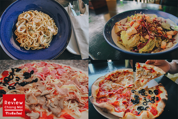 Spaghettie Seafood Whitewine 150 บาท ซีซาร์สลัด 140 บาท Pizza Four Seasons 220 บาท แป้งบางกรอบ เสิร์ฟพร้อมทูน่า เบคอน เห็ด และมะกอกดำ