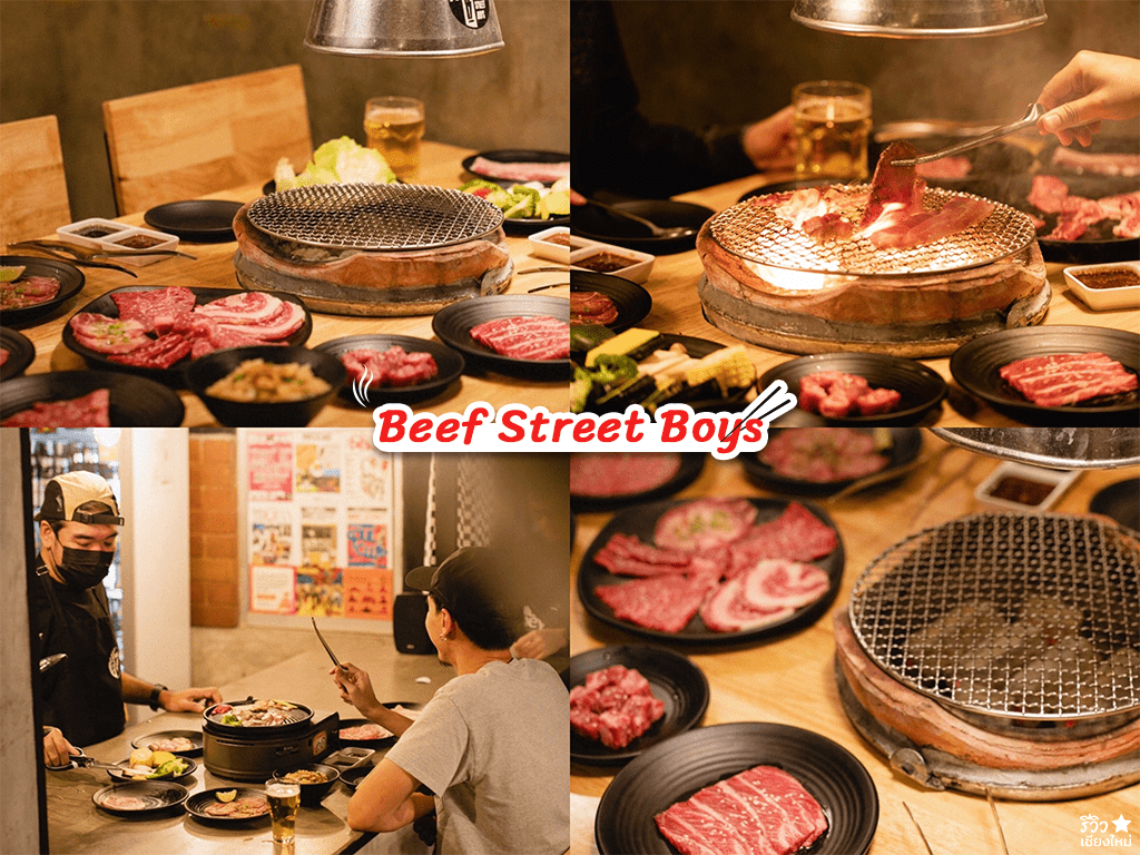 ร้านปิ้งย่างเสิร์ฟแบบ A La Carte เสิร์ฟเนื้อไทยวากิวมากมายหลายส่วน ไม่ว่าจะเป็น เนื้อคารูบิ ฮารามิ ร่องซี่โครง และอื่นๆ เสิรฟ์พร้อมน้ำจิ้มแจ่วสูตรเฉพาะ และน้ำจิ้มญี่ปุ่น จาก Beef Street Boys