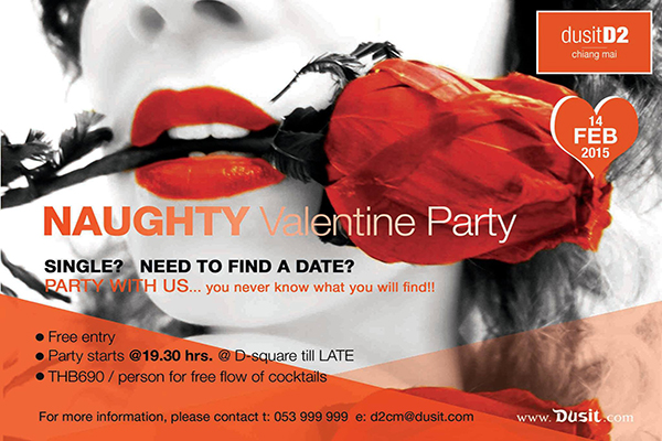 ”NAUGHTY valentine party”- 14 February 2015 เชิญคนมีคู่ควงแขนกันมา เชิญคนโสดสะบัดบ็อบโชว์สเต็ป กับปาร์ตี้วาเลนไทน์สุดเก๋ NAUGHTY valentine party! ชวนคุณมาโชว์สเต็ปความมันส์ ในค่ำคืนวันเสาร์ที่ 14 กุมภาพันธ์ ที่คุณจะได้พบกับปาร์ตี้สุดเก๋ ภายใต้ธีมขาว-แดง และดีเจสุดฮิปที่พร้อมมาบรรเลงความมันส์ให้คุณได้ปลดปล่อยความรักตลอดคืน อีกทั้งภายในงานยังมีบาร์เครื่องดื่ม 3 ชั่วโมงเต็มในราคาพิเศษสุดคุ้ม ที่จะคุณได้ลิ้มลองความสดชื่นของหลากหลายเมนูค็อกเทล โดยดีสแควร์ จะถูกแปลงโฉมให้เป็นเล้านจ์โซน พื้นที่โทนสนุกสําหรับแฮงค์เอ้าท์ ด้านหน้าโรงแรมดุสิตดีทู เชียงใหม่