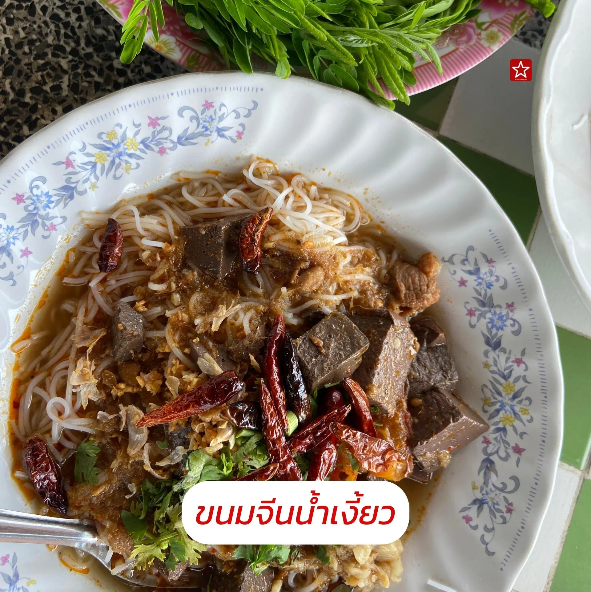 มาถึงเมนูสุดท้ายอย่าง ขนมจีนน้ำเงี้ยว ที่กินกันง่ายๆ ไปตามกาด นั่งก้อม ดูดเส้น ซดน้ำเงี้ยว ตามด้วยแคบหมู ข้าวปอง เหมาะ! มีหลากหลายสูตรแตกต่างกันไปตามท้องที่ ขาดไม่ได้เลยคือดอกงิ้ว เลือดไก่ก้อน และมะเขือเทศ และที่สำคัญจะอร่อยหรือไม่ก็ขึ้นอยู่กับพริกแกงน้ำเงี้ยวนั่นเอง บอกเลยว่าจะซื้อกินหรือทำเองที่บ้านก็ง่าย บางสูตรใช้ถั่วเน่าเเข็บหรือถั่วเน่าแผ่นย่างไฟใส่ในเครื่องแกง แทนการใส่เต้าเจี้ยวเพื่อเพิ่มความหอมอีกด้วย
