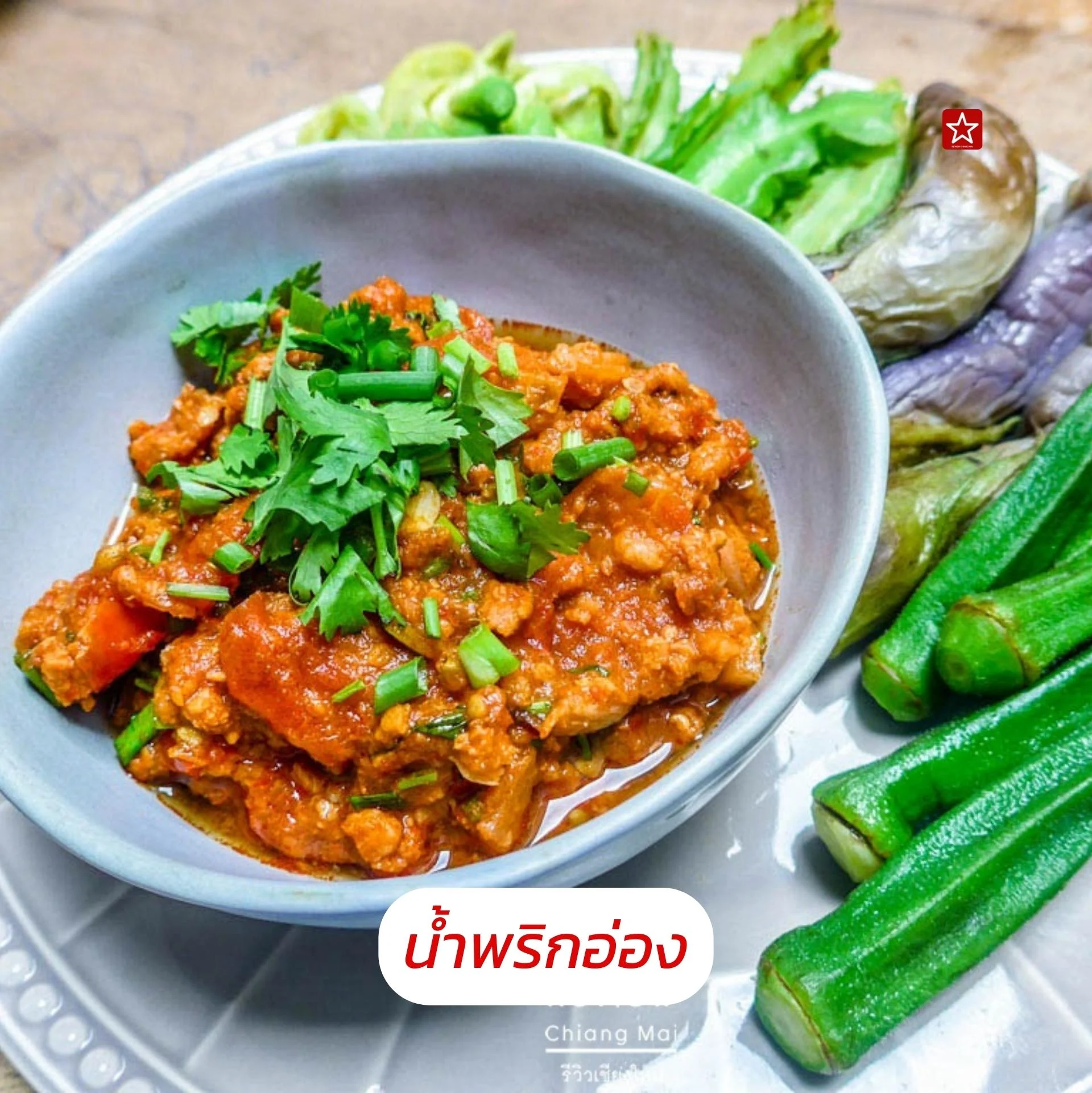 มาเริ่มกันที่เมนูแรกในหมวดน้ำพริกอย่างน้ำพริกอ่อง ที่เด็กกินได้ ผู้ใหญ่กินดี เป็นน้ำพริกที่ไม่เผ็ดมากและได้ประโยชน์เต็มๆ จากวิตามินเอ เพราะมีนางเอกชูโรงอย่างมะเขือเทศ เพิ่มสีสันให้น้ำพริกเป็นสีส้ม ผนวกกับเครื่องแกงที่กลมกล่อมด้วยพริกแห้ง กระเทียม หัวหอม รากผักชี กะปิ และเกลือ บางสูตรใส่ถั่วเน่าเเข็บหรือเต้าเจี้ยวเข้าไปด้วยในการปรุงรส น้ำพริกจะมีรสชาติ เปรี้ยว เค็ม เผ็ดเล็กน้อยและหวานตาม กินได้กับทุกอย่างไม่ว่าจะเป็นผักสด ผักต้ม แคปหมู ฯลฯ