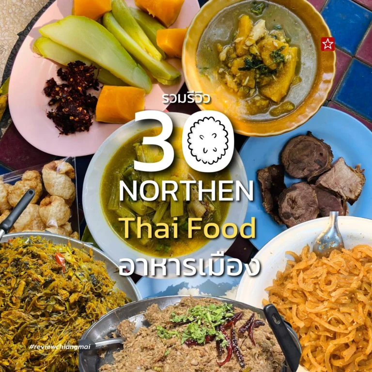 อาหารเหนือ – อาหารเมือง ของกิ๋นบ้านเฮา เลือกเอาเต๊อะนาย เป๋นของปื้นเมือง เป๋นเรื่องสบาย ล้วนซะป้ะมากมี ฟังฮื้อดีเน้อ ฟั่งใค้อยากจนเผลอ มาบลืนน้ำลาย คุ้นหูกันหรือเปล่ากับเพลง “ของกิ๋นคนเมือง” ของจรัล มโนเพ็ชร ที่ในเพลงถ่ายทอดเมนูอาหารเหนือกว่า 30 เมนู ซึ่งเป็นเมนูลับเด็ดเฉพาะที่คนเมืองเปิ้นกิ๋นกั๋น มีครบตั้งแต่ น้ำพริก ม๊อก แกง จอ คั่ว ลาบ ตำ ยำ เจียว นึ่ง หมก ปิ้ง ย่าง ทอด แอ็บ อ่อง หมักดอง แต่ด้วยสภาพสังคมและสภาพแวดล้อมที่เปลี่ยนไป ทำให้บางเมนูในเพลงหากินได้ยาก อย่างไรก็ตามยังมีเมนูเฉพาะที่คนเหนือทำกินกันอีกมากมายนอกเหนือจากในเพลง วันนี้รีวิวเชียงใหม่เลยจะชวนทุกคนมาเช็คลิสต์ 30 อาหารเหนือ อาหารเมือง ตามกาด ปลุกความเหนือในตัวคุณไปพร้อมกัน!