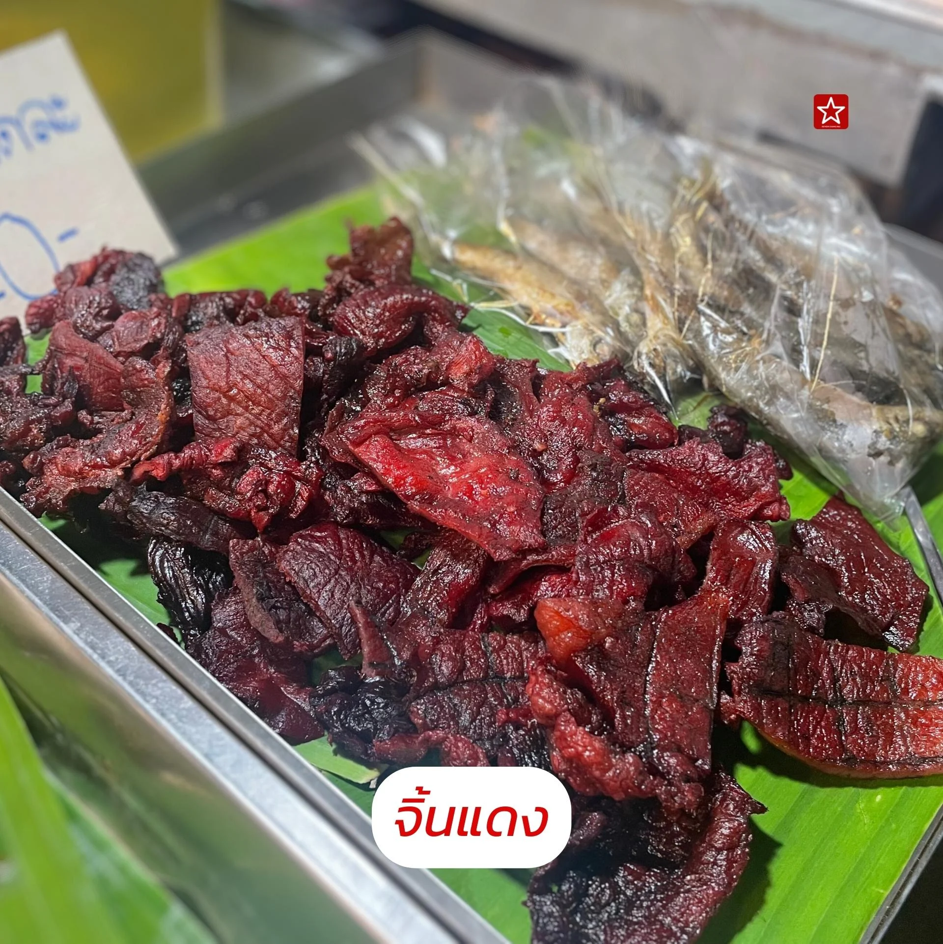 สูเขา บะฮู้จักจิ้นแดงในตำนานแต้ก่า! จิ้นแดง หรือจิ้นเกลือ เป็นหมูแดดเดียวสูตรเฉพาะของลำปาง สีแดง กรอบ รสชาติหวาน เค็ม นัวๆ กินกับข้าวเหนียวอร่อยมาก เดี๋ยวนี้หากินค่อนข้างยาก แต่ถ้าเดินตามกาดก็ยังพอมีให้เห็นบ้าง ใครยังไม่เคยลอง ต้องไปหากินนะ เด็ดมากจริงๆ