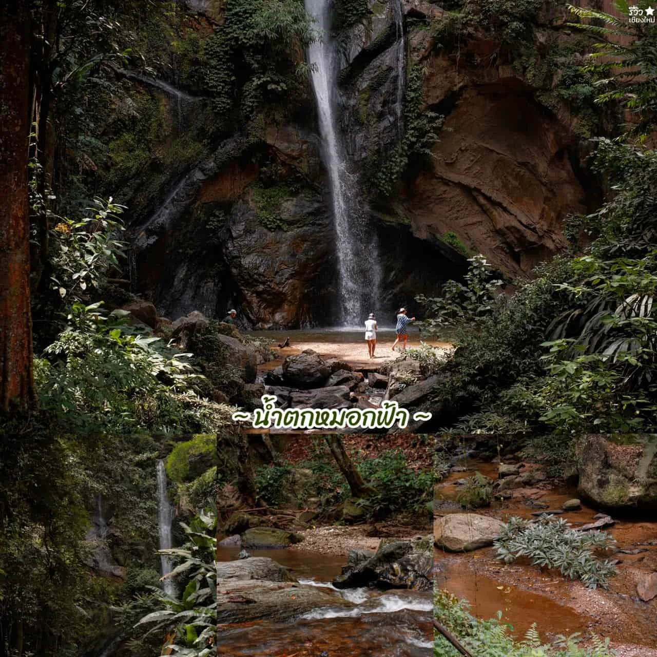 น้ำตกหมอกฟ้า ตั้งอยู่ที่บริเวณของ หน่วยพิทักษ์อุทยานแห่งชาติดอยสุเทพ-ปุยที่ 5 มีต้นไม้เขียวขจีน้ำใสไหลเย็น น้ำตกสูง 30 เมตร ตกมาสู่แอ่งน้ำขนาดใหญ่ด้านล่าง จนเกิดเป็นละอองฟุ้งกระจาย เหมือนหมอก จึงเป็นที่มาของชื่อน้ำตกนี้