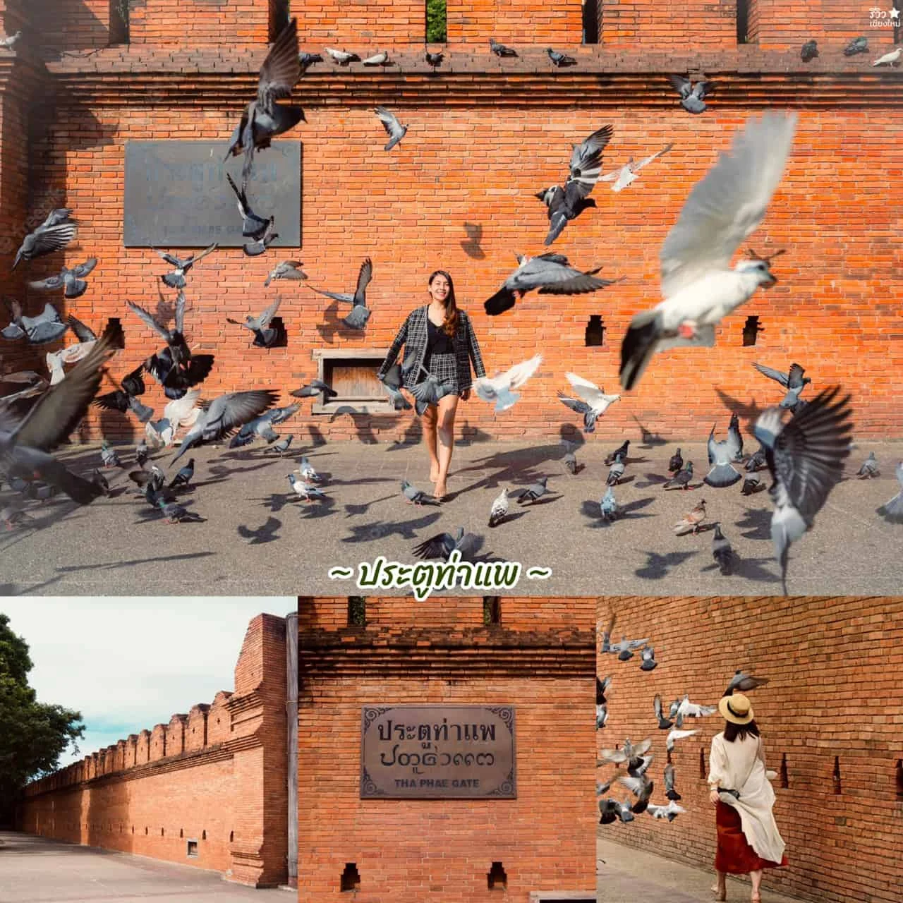 จุดช็คอินยอดนิยมของเชียงใหม่ 1 ในซิกเนเจอร์ที่ใครมาเชียงใหม่จะต้องมาเยือน ภาพที่เราจะเห็นอยู่บ่อยๆ คือภาพที่นักท่องเที่ยวมาถ่ายรูปกับฝูงนกบิน ตัดกับกำแพงสีอิฐสวยๆ ทำให้เป็นภาพจำของการมาที่ประตูท่าแพไปแล้วว
