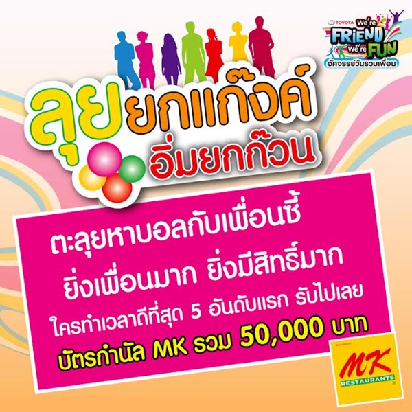 • ลุยยกแก๊งค์ อิ่มยกก๊วน ตะลุยหาบอลพิเศษในบ่อลูกบอลขนาดยักษ์กับเพื่อนซี้ยิ่งเพื่อนมาก ยิ่งมีสิทธิ์มากใ ครทําเวลาได้ดีที่สุด 5 อันดับแรก รับไปเลยบัตรกํานัล MK รวม 50,000 บาท