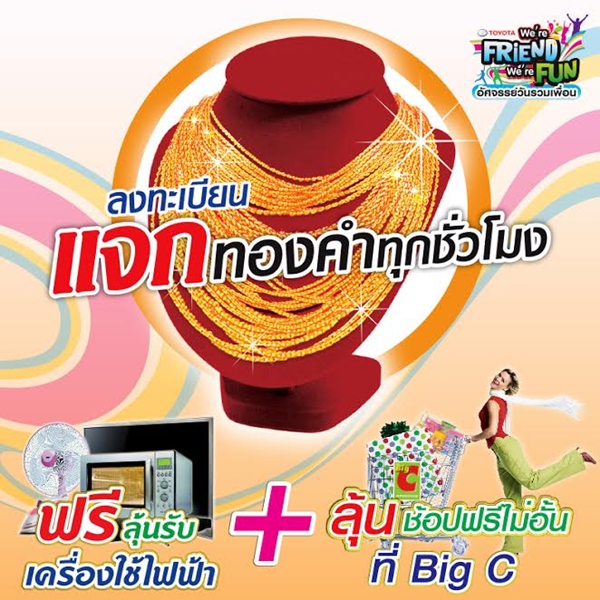 • โตโยต้าล้านนา ทอง ทอง ทอง เพียงลงทะเบียนเข้าร่วมงาน ลุ้นรับทองคํา เครื่องใช้ไฟฟ้า และสิทธิ์ในการช้อปปิ้งไม่อั้นที่บิ๊กซีทุกชั่วโมง