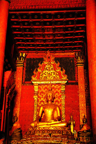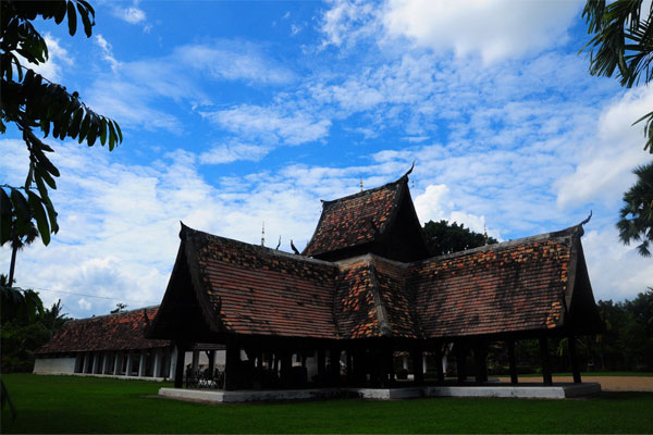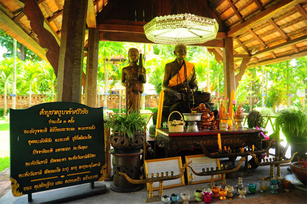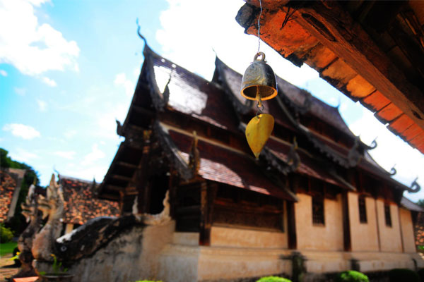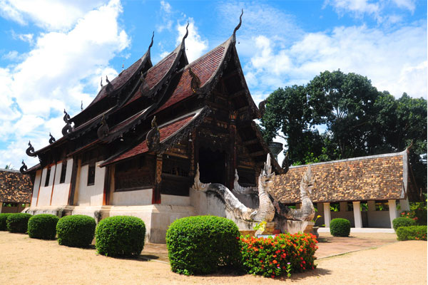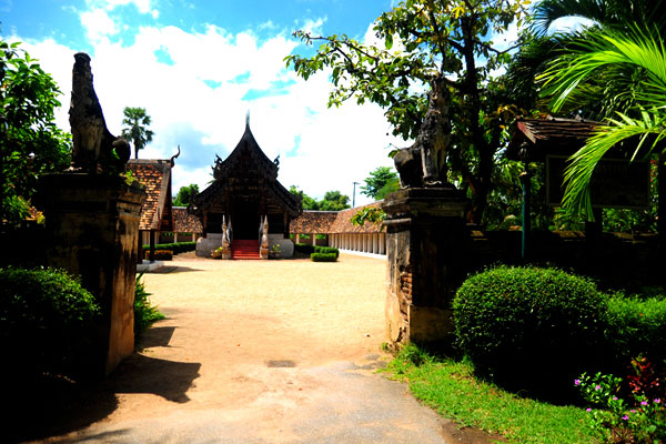 ถัดจากลานทราย ก็เป็นศาลาบาตร รูปตัว U อ้อมวิหารไว้ทั้งสามด้าน ส่วนทางซ้ายมือ ด้านหน้าวิหารจะเป็นมณฑปไม้จัตุรมุข ที่มีรูปเหมือนครูบาศรีวิชัย ประดิษฐานให้พวกเราได้สักการะ ที่แต่เดิมได้ประดิษฐาน พระธาตุศรีจอมทอง ซึ่งอัญเชิญ มาจากอำเภอจอมทอง ขึ้นไปที่เชียงใหม่ บริเวณรอบๆก็เป็นสนามหญ้า นิ่มสบายเท้า เหมาะแก่การเดิน เบาๆ หรือเลือกมานั่งสมาธิวิปัสนา …….วิหารไม้เก่าแก่ สร้างราว พ.ศ. 2399-2412 ในรัชสมัยของพระเจ้ากาวิโลรสสุริยวงศ์ เป็นเจ้าหลวงเชียงใหม่ ด้านในเสาวิหารทำด้วยไม้ต้นเดียวทั้งเสา …..โอบไม่รอบ พระประธาน ประดิษฐาน อยู่บนฐานแก้ว หน้าบัน ประดับกระจกไว้สวยงาม แต่ก็ร่วงโรยตามกาลเวลา ลวดลายฉลุแกะสลัก งานไม้ ฝีมือระดับชั้นครู ตามแบบล้านนา พญานาค อ่อนช้อยสวยงาม ราวมีชีวิต ….ช่างให้เกิด ความรู้สึก สงบ สมเป็นวัดอย่างแท้จริง ผมนึกอยู่นานว่าเหมือนเคยเห็น วิหารแบบนี้ที่ไหน ….ก็หอคำหลวงในอุทยานหลวงราชพฤกษ์ นั้นเอง ที่ได้ต้นแบบไปจาก วิหารไม้หลังนี้