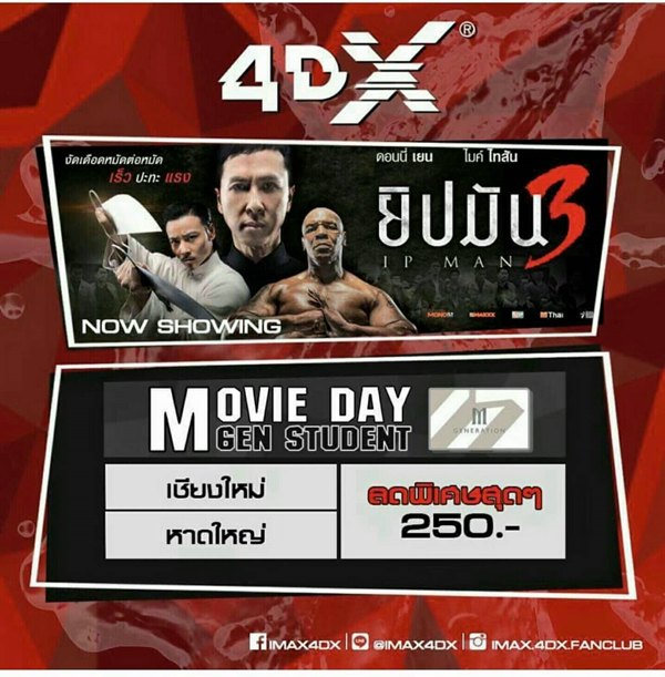 4DX จัดเต็มสำหรับสมาชิกบัตร MGen Student ดู “Ip Man 3(ยิปมัน 3)” ในราคา 250.- เท่านั้น 21/1/2016 reviewchiangmai News&Event 2 Share on FacebookFacebookXXLINELine 4DX จัดเต็มให้โปรโมชั่นสุดพิเศษเฉพาะสาขาเชียงใหม่… สำหรับนร.นศ.สมาชิกบัตร MGen Student ทุกวัน และ MOVIE DAY ทุกวันพุธ ราคาเริ่มต้นเพียง 250 บาทเท่านั้น วันนี้ – 23 มี.ค. 2559 IMX4DX Ip Man 3 MGen Stdent movie day ยิปมัน 3 โปรโมชั่นดูหนัง