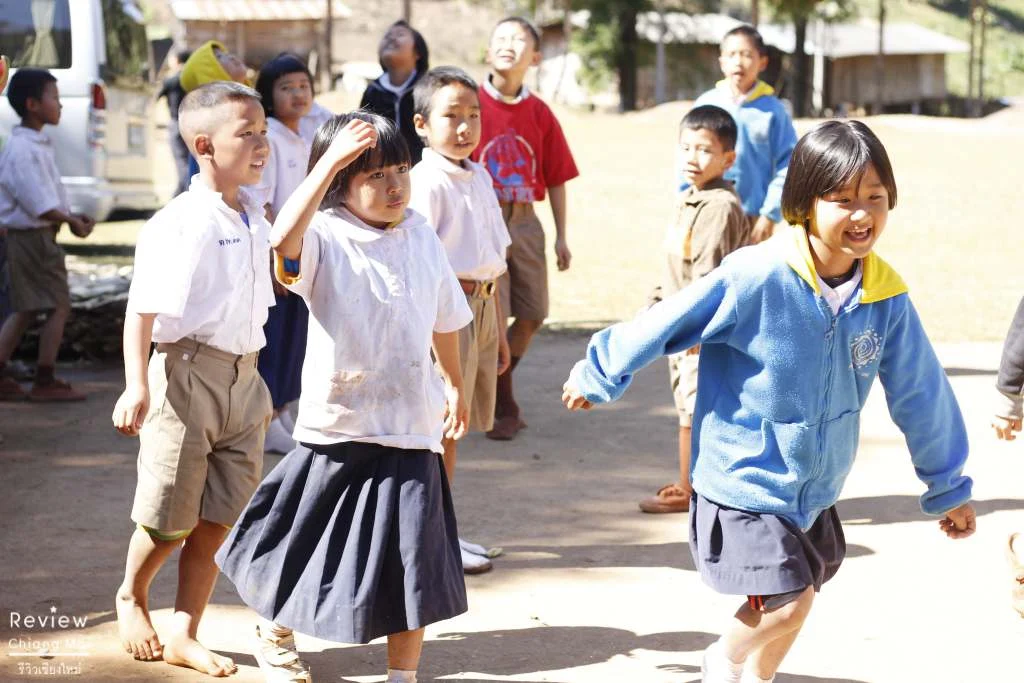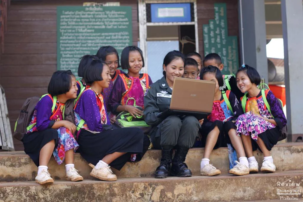 ห้องเรียนที่นี่กว้างมากกก เพราะอยู่กลางสนามกีฬาเลย เด็กๆ บอกว่าตอนเช้าอากาศหนาวมากเลยต้องย้ายมาเรียนกันที่สนาม ถึงจะอยู่กลางหุบเขาและห่างจากบริเวณชายแดนพม่าไม่กี่กิโลเมตรแต่สัญญาณโทรศัพท์ยังชัด เล่นโซเชียลได้ชิวเหมือนอยู่นิมมานฯ