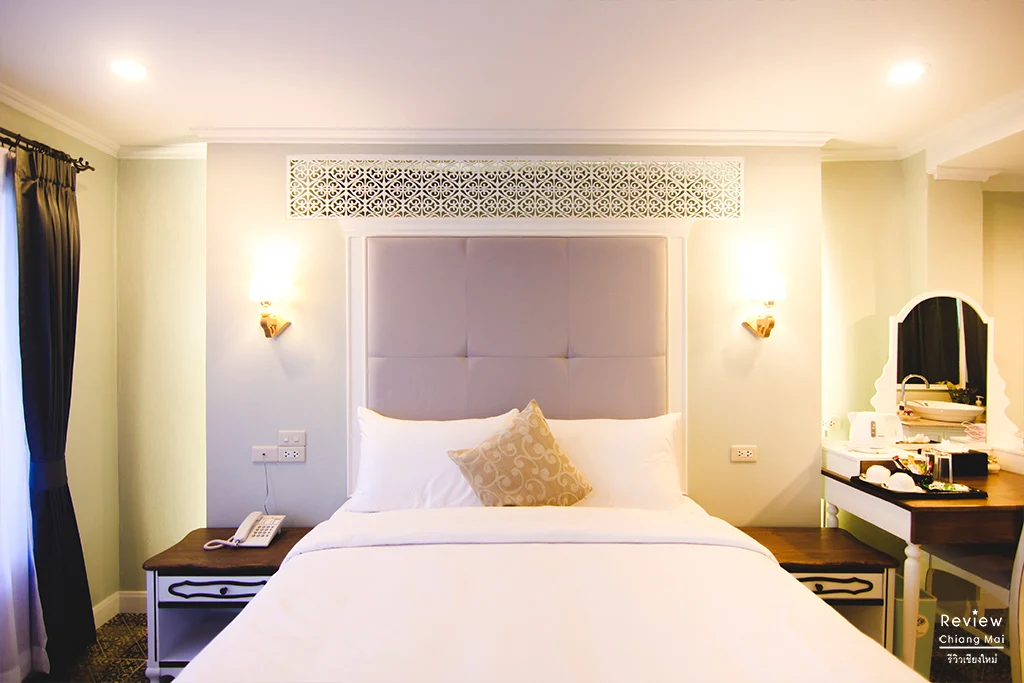 ไฮไลท์อยู่ที่หัวเตียง ทำจากพลาสติกวู้ดฉลุลาย สีขาว ซ่อนไฟอินไดเร็กไลท ์ทำให้ห้องดูมี Detail ที่สื่อถึงความพิถีพิถัน ในทุกรายละเอียดจริงๆ ครับ ผ้าบุหัวเตียงเป็นผ้าไหมเทียมหุ้มฟองน้ำ สีเทาอมฟ้า เพิ่มความเรียบหรูใหกับห้องได้ดีมากๆครับ