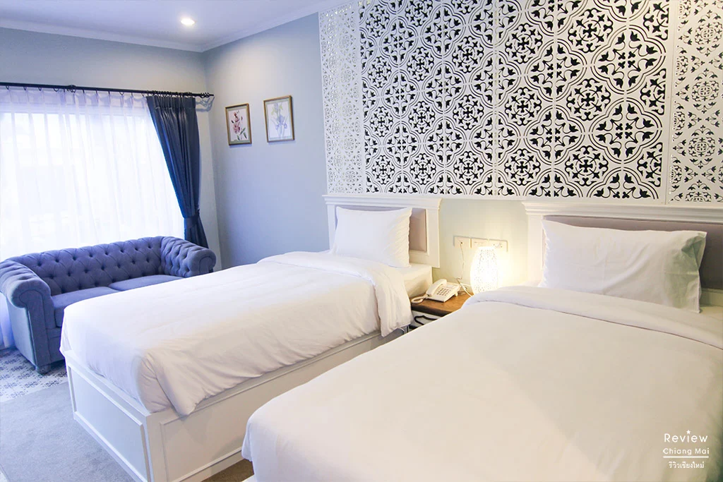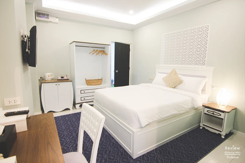 ไฮไลท์อยู่ที่หัวเตียง ทำจากพลาสติกวู้ดฉลุลาย สีขาว ซ่อนไฟอินไดเร็กไลท ์ทำให้ห้องดูมี Detail ที่สื่อถึงความพิถีพิถัน ในทุกรายละเอียดจริงๆ ครับ ผ้าบุหัวเตียงเป็นผ้าไหมเทียมหุ้มฟองน้ำ สีเทาอมฟ้า เพิ่มความเรียบหรูใหกับห้องได้ดีมากๆครับ