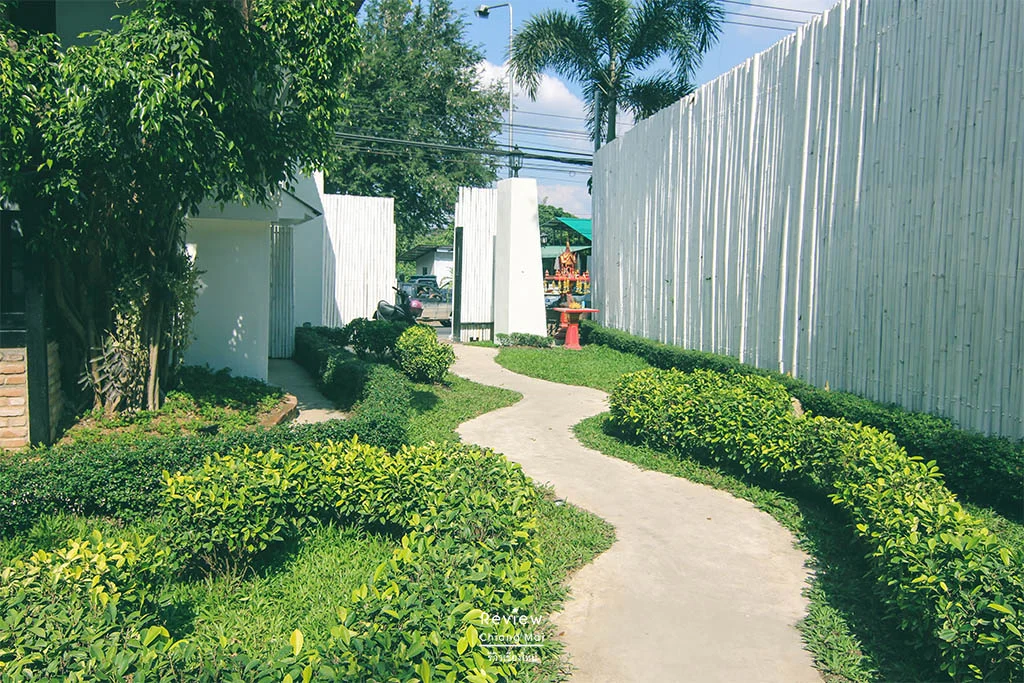 พอพ้นจากทางเดินที่กั้นด้วยแนวไม้ไผ่สีขาวสูงราว 3 เมตร เป็นแนวกำแพงเพื่อให้แขกที่มาพักมีความเป็นส่วนตัวตัดขาดจากโลกภายนอก ต่อจากนั้นมีทางเดินคดเคี้ยวเป็นเส้นโค้งสองข้างทางเป็นไม้พุ่มเตี้ยๆ ขนานไปกับทางเดิน