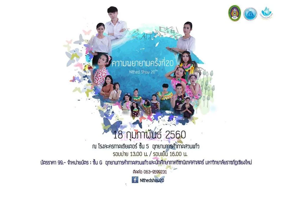 มาร่วมเป็นกำลังใจให้กับความพยายามครั้งที่ 20 กับละครเวนิเทศโชว์ครั้งที่ 20 โดยนักศึกษาภาควิชานิเทศศาสตร์ คณะวิทยาการจัดการ มหาวิทยาลัยราชภัฏเชียงใหม่ รอบบ่าย 13.00 น. และรอบเย็น 16.00 น. บัตรราคา 99 บาท