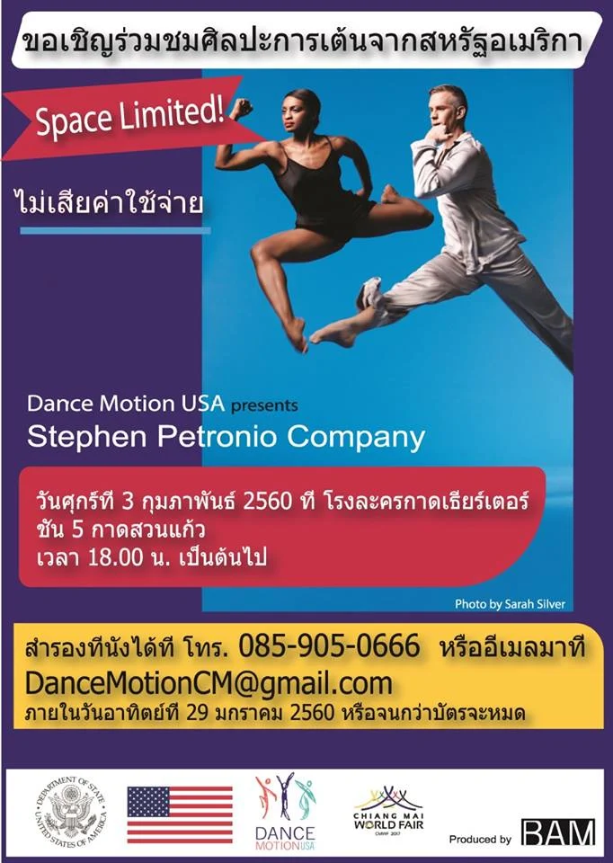 งานแสดงศิลปะการเต้น Dance Motion บัลเลต์แนวโพสต์โมเดิร์นครั้งแรกในจังหวัดเชียงใหม่ จัดขึ้นในวันที่ 3 กพ. 60 เวลา 18.00-20.45 น. ณ โรงละครกาดเธียเตอร์ ชั้น 5 อุทยานการค้ากาดสวนแก้ว เข้าชมฟรี! สามารถจองบัตรได้ที่ [email protected]