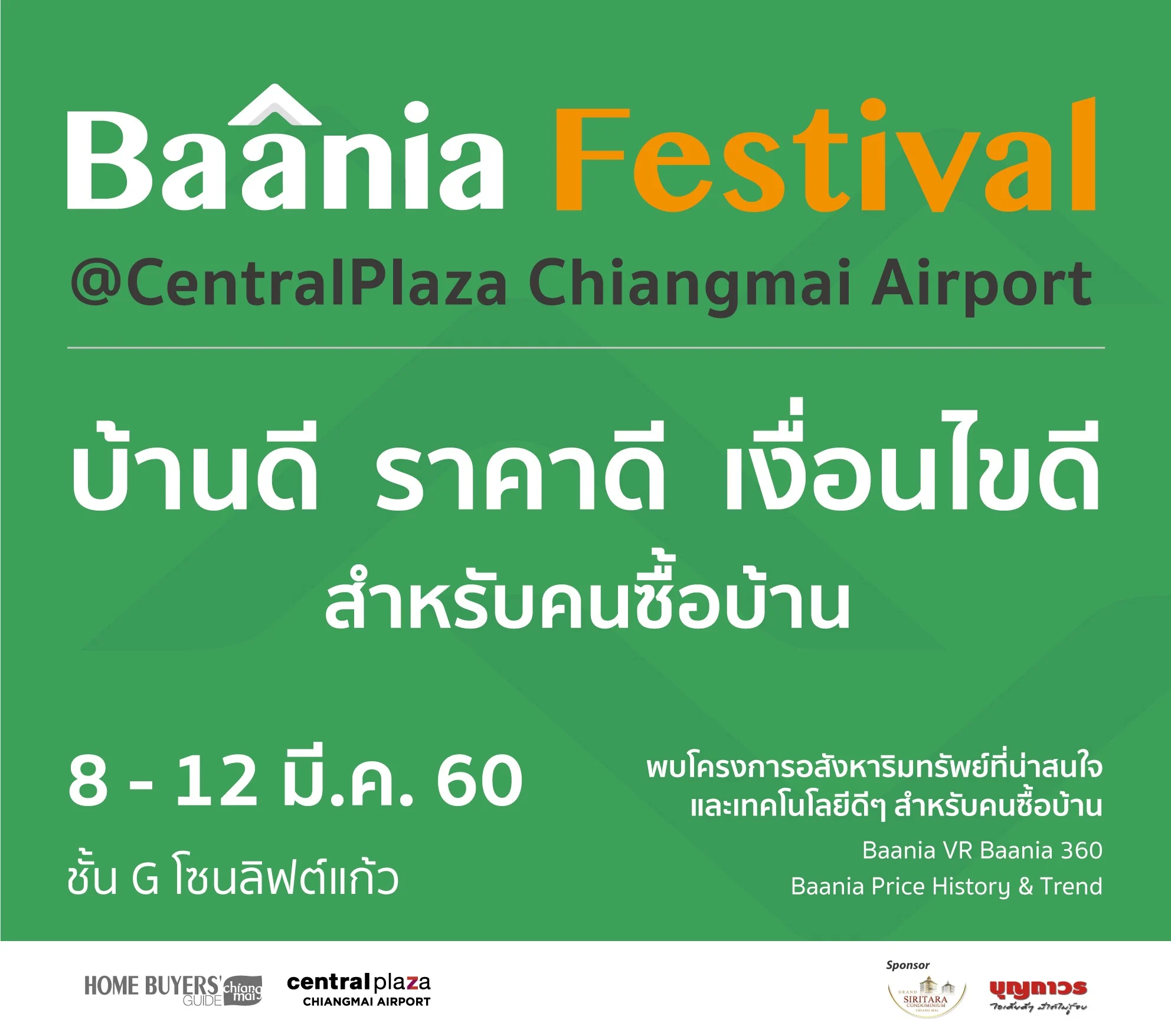 ศูนย์การค้าเซ็นทรัลพลาซา เชียงใหม่ แอร์พอร์ต ขอเชิญทุกท่านร่วมงาน “Baania Festival @CentralPlaza Chiangmai Airport” งานนี้งานเดียวมีให้คุณครบทุกอย่าง ตามคอนเซ็ปท์ “บ้านดี ราคาดี เงื่อนไขดี” สำหรับคนซื้อบ้าน แถมด้วยเทคโนโลยีดีๆ สำหรับคนซื้อบ้านในยุคดิจิตอล พบกับโครงการอสังหาริมทรัพย์ที่น่าสนใจ อาทิ โครงการบ้านจัดสรร, คอนโดมิเนียม, ทาวน์เฮ้าส์, ทาวน์โฮม, ทรัพย์สินรอขาย และสินค้าแต่งบ้านหลากสไตล์ในราคาสุดพิเศษ พร้อมโปรโมชั่นสุดแรง ลด แลก แจก แถม จัดเต็มทุกข้อเสนอ