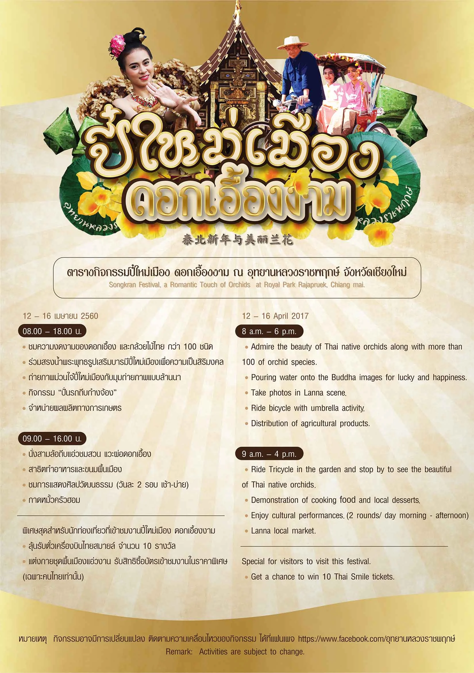 นางวรุมดี ภาคสินธ์ หัวหน้ากลุ่มการตลาดและกิจกรรม เผยว่า “ตามที่อุทยานหลวงราชพฤกษ์ สถาบันวิจัยและพัฒนาพื้นที่สูง (องค์การมหาชน) ได้จัดงาน “ปี๋ใหม่เมือง ดอกเอื้องงาม (Songkran Festival, a Romantic Touch of Orchids)” เป็นประจำขึ้นทุกปีนั้น ได้รับการตอบรับจากนักท่องเที่ยวทั้งชาวไทยและชาวต่างประเทศเป็นอย่างดี และในปีนี้เพื่อเป็นการอนุรักษ์และเผยแพร่ให้นักท่องเที่ยวที่จะมาเที่ยวจังหวัดเชียงใหม่ในช่วงสงกรานต์นี้ สำหรับปีนี้ อุทยานหลวงราชพฤกษ์ได้จัดงานภายใต้แนวคิด “นั่งสามล้อ ผ่อดอกเอื้อง จวนแอ่วปี๋ใหม่เมือง ตี้อุทยานหลวงราชพฤกษ์” วันที่ 12 – 16 เมษายน 2560 เวลา 08.00 – 18.00 น. ซึ่งได้รับความร่วมมือกับชุมชนสามล้อโรตารีเชียงใหม่ เพื่อเป็นการอนุรักษ์วิถีชีวิตอาชีพรถสามล้อถีบอันเป็นสัญลักษณ์
