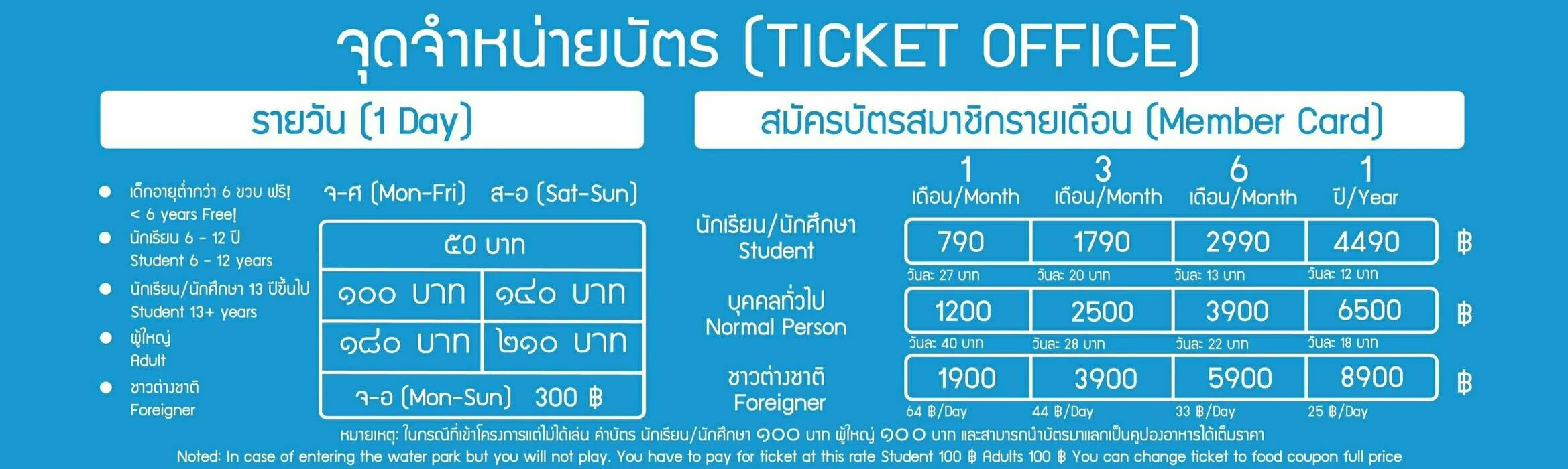สำหรับท่านไหนที่เข้ามาใช้บริการแต่ไม่ลงเล่นน้ำสามารถซื้อบัตรในราคา 100 บาทและนำบัตรไปแลกซื้ออาหารหรือเครื่องดื่มต่างๆ ภายในโครงการได้เต็มราคา 100 บาท