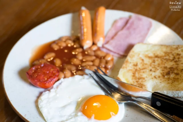 มื้อเช้าแม่บ้านเตรียมอาหารเช้าเป็น English Breakfast, ข้าวต้มทรงเครื่อง, นม, น้ำส้มและผลไม้