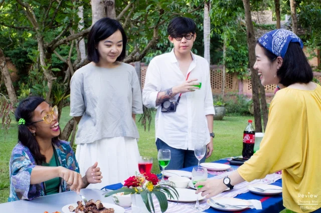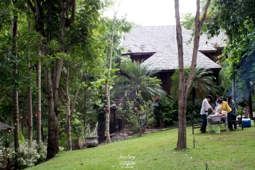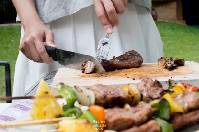 ช่วงแดดร่มลมตก แม่ครัว ผู้จัดการ และคนสวน เตรียมยกอุปกรณ์ปิ้งย่าง โต๊ะสนามขนาด 10คน กระติกน้ำแข็งใบใหญ่ เตรียมก่อไฟฟืน บาร์บีคิวที่เตรียมมามีหลายไม้ สำหรับแขกที่มาพักสามารถระบุได้ว่า มื้อเย็นนั้นจะเป็นบาร์บีคิวหรือเมนูอื่นๆ ตามความชอบ