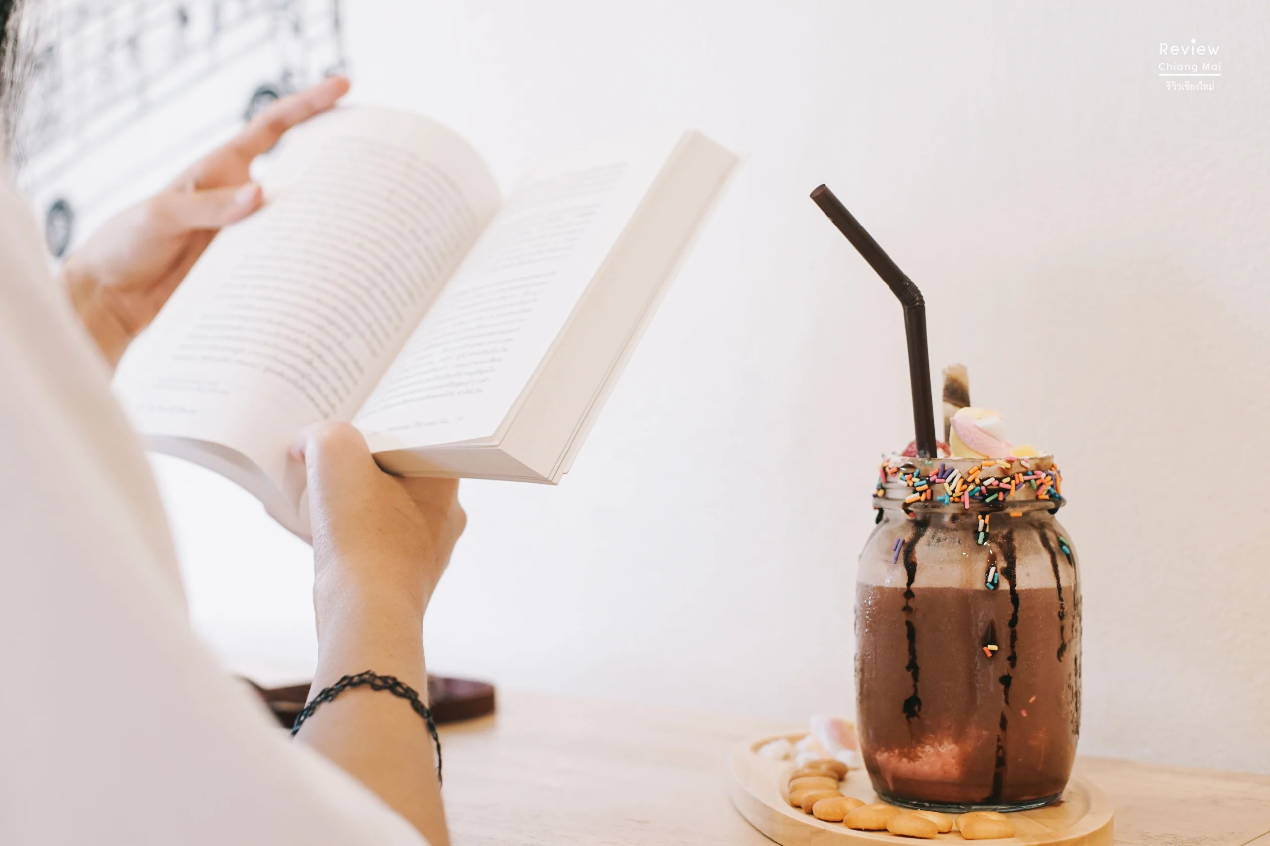 เริ่มกันด้วยมุมนั่งอ่านหนังสือเกร๋ๆ แนะนำเลยว่าต้องเป็นเก้าอี้นั่งหน้าบาร์ ในร้านไม่เสียงดังวุ่นวาย มีมุมให้ทำงานนั่งอ่านหนังสือกินขนมซึ่งน่ารักมาก สำหรับเมนูน้ำที่เราสั่งมาคือทุกแก้วจะมีขนมปัง A B C เรียงเป็นคำน่ารัก มีเยลลี่ให้เรากินเล่นด้วยหละ เราเลยกระหน่ำถ่ายภาพกับเพื่อนกับเครื่องดื่มใหญ่เลย
