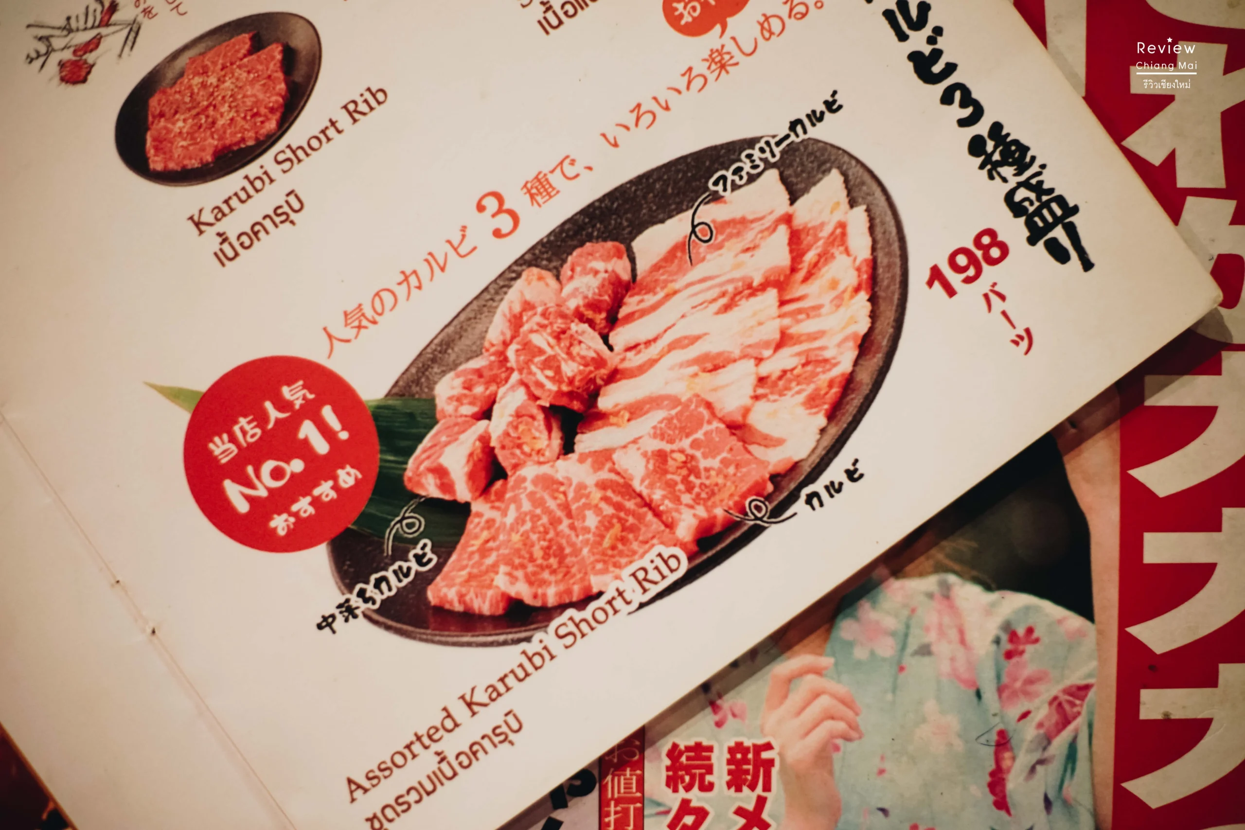 หลังจากรองท้องไปแล้วพระเอกของเราก็ทยอยมากับพักพวก เราเริ่มจากชุดเนื้อรวมคาบูริ カルビ (Karubi) หรือ かたばら (Kata Bara) เป็นเนื้อส่วนไหน? ก็คือ เนื้อส่วนบริเวณส่วนอกถึงท้อง ที่ถึงแม้จะมีกล้ามเนื้ออยู่มาก(ไม่เหนียวนะ) แต่ก็มีไขมันปะปนอยู่ จึงมีความอ่อนนุ่ม เป็นเนื้อยอดนิยมในร้านเนื้อย่าง ทางร้านจัดมาเซ็ตแค่ 198 บาท