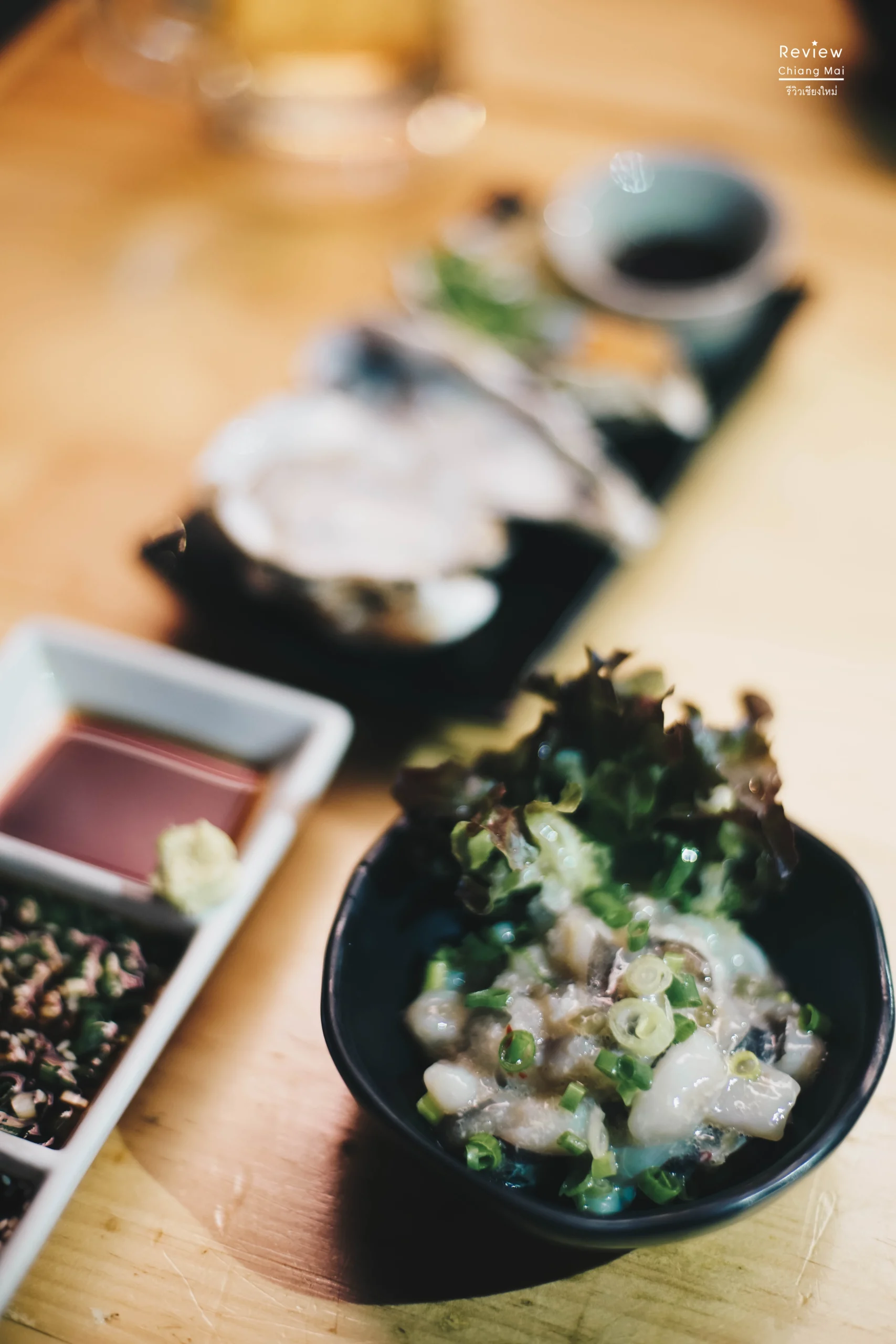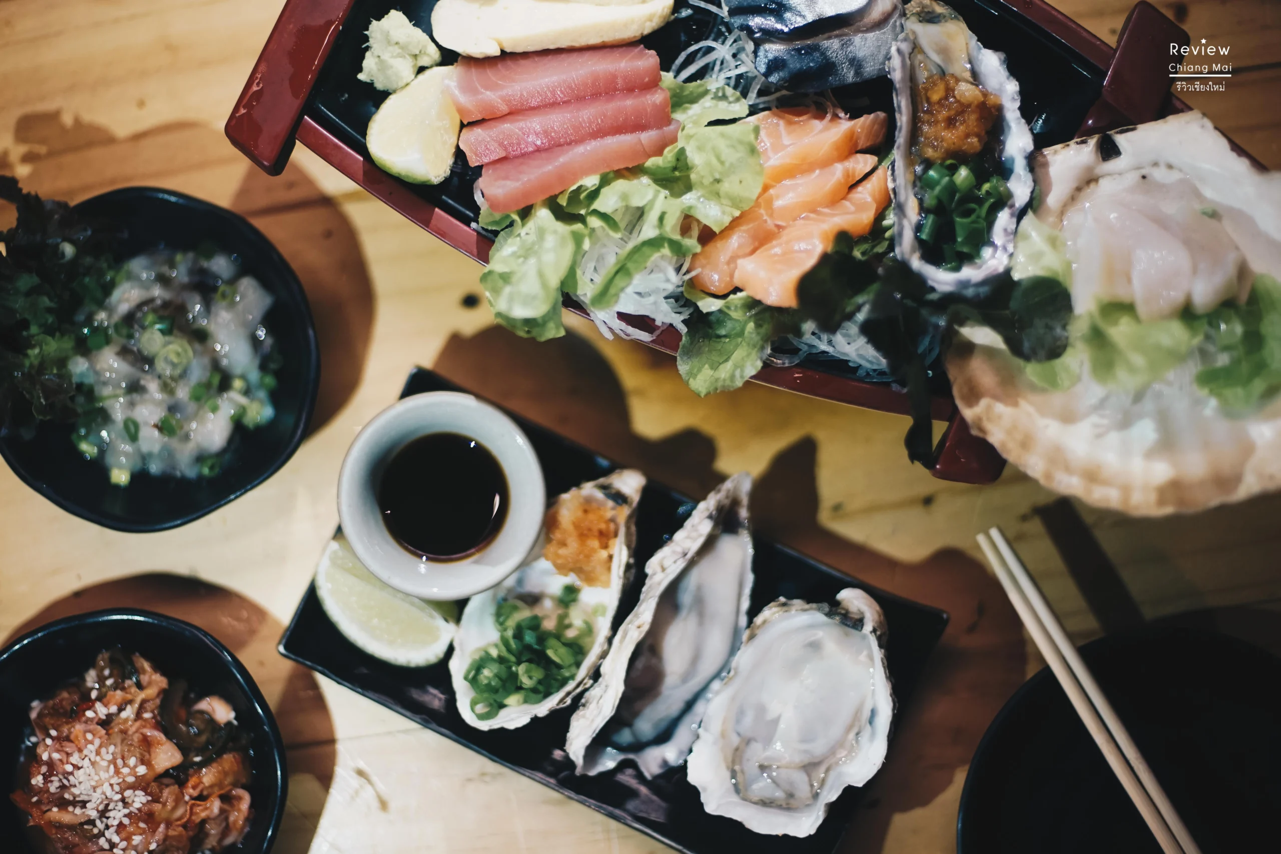 มาเริ่มรองท้องที่อาหารญี่ปุ่นสุดคุ้นเคยอย่าง ซาซิมิเซตรวม อย่างละ 3 ชิ้นในเรือลำใหญ่ ทูร่าเนื้อแน่นให้สัมผัสค่อนข้างดี แซลมอน ปลาซาบะดอง หอยนางรม หอยเชลล์เนื้อนุ่มกรุบกริบที่มาพร้อมกับหัวไชเท้าบดคลุกพริกป่นรสเผ็ด หอมซอย โชยุ เรียกได้ว่าร้านนี้ค่อนข้างละเอียดอ่อนด้านการกินแบบญี่ปุ่นจริงๆ นี่จึงไม่แปลกใจว่าทำไมชาวญี่ปุ่นและชาวเกาหลีจึงเต็มร้าน จนคิดว่านี่คือญี่ปุ่นหรือเวียงบัวกันแน่
