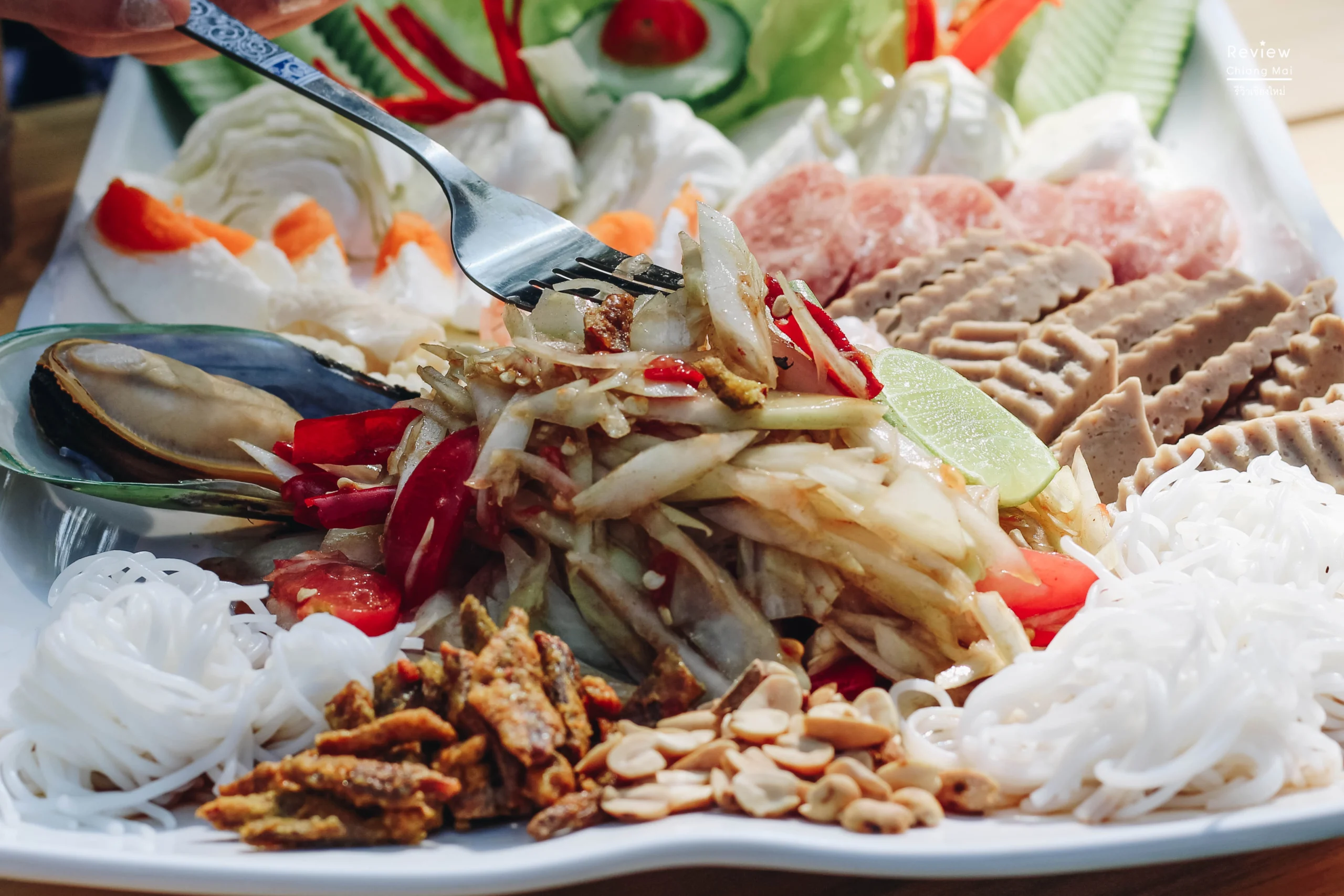 ปลากกรอบ ไข่เค็ม หมูยอปลาหมึก หอย ผักเครื่องเคียง เส้นขนมจีน ติดหวานนิดๆ เผ็ดตาม เปรี้ยวกลมกล่อม