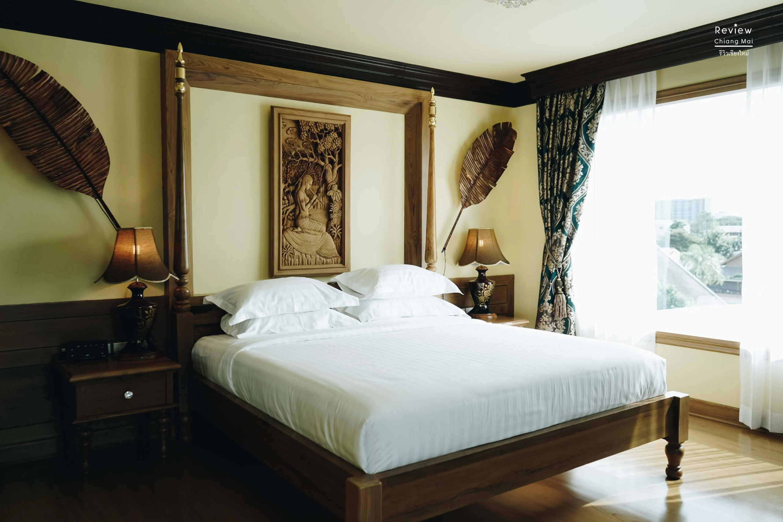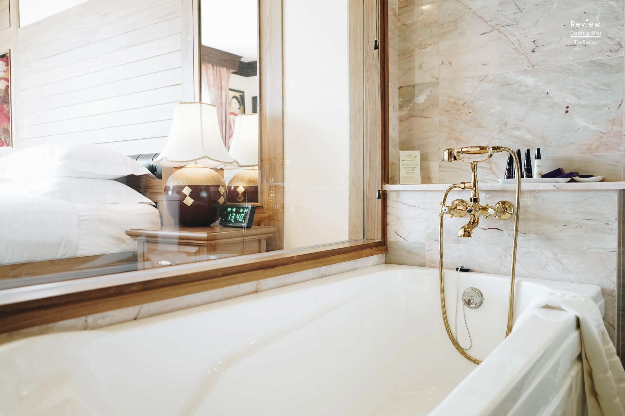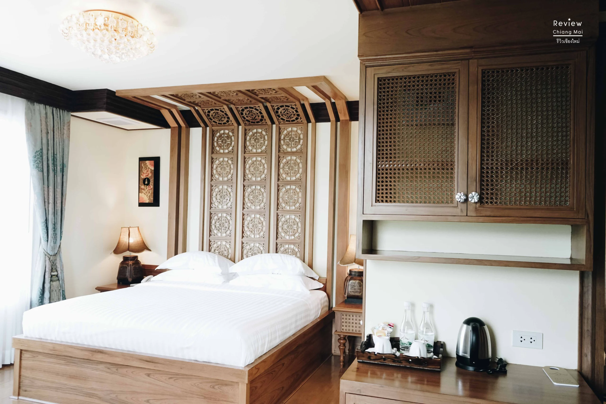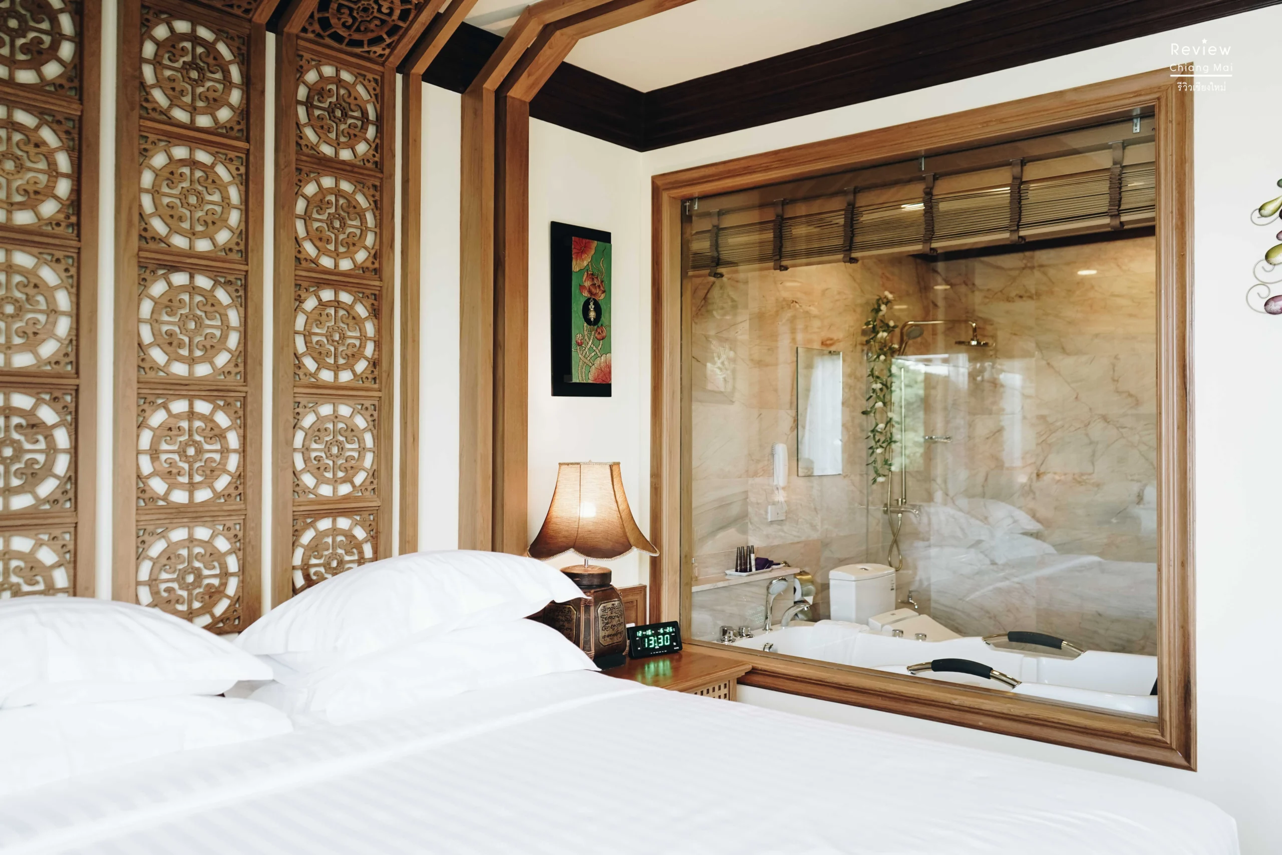 ห้องตกแต่งด้วยไม้สัก หรูหราแบบล้านนาที่แต่ละห้องจะตกแต่งไม่เหมือนกัน ซึ่งจะต่างไปตามแรงบัลดาลใจจากภาพวาดที่ใช้ตกแต่งห้อง และที่เกร๋มากๆคือห้องน้ำจ้า มองเห็นจากห้องนอนได้ และเป็นอ่าง Jacuzzi ทุกห้อง บอกแล้วว่าโคตรสบาย อบอุ่น นอกจากนี้ยังมีรายละเอียดเล็กๆเช่นราวจับเพื่อความปลอดภัยอีกด้วย