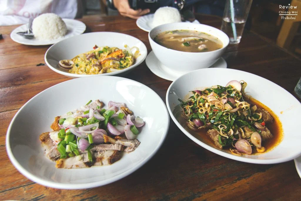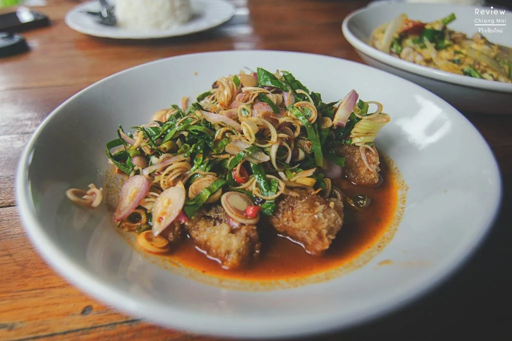 ลองแกงส้มก็หันมาหากระเพราหมูกรอบ ทีเด็ดอยู่ตรงใบกระเพราทอดกรอบที่ทางร้านเอามาใส่ด้วย รวมถึงขนาดของหมูกรอบที่พอดีคำ รวมถึงน้ำกระเพราที่ให้เยอะจนแทบจะกินกับข้าวได้ทั้งจาน หลังจากลิ้มลองกระเพราหมูกรอบไปแล้วเลี้ยวมาตักยำปลาดุกฟู จัดได้ว่าเด็ดไม่แพ้แกงส้ม ทั้งรสชาติของน้ำยำ สัมผัสของเนื้อปลาดุกเรียกได้ว่าโดนใจวัยรุ่นหลายๆ เด้อ