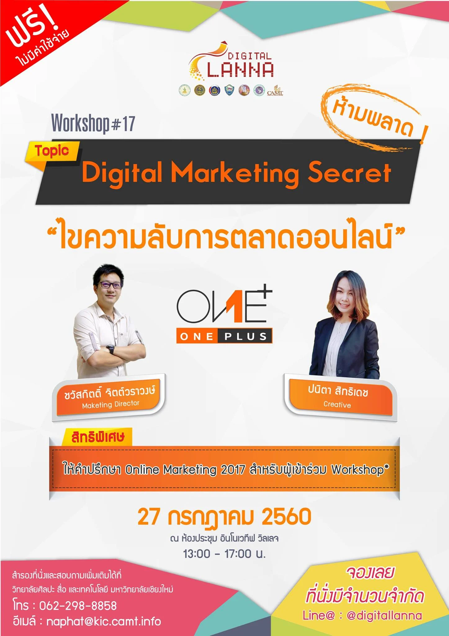 พบกันใน Workshop หัวข้อ “Digital Maketing Secret” โดย คุณชวัตกิตต์ จิตต์วราวงษ์ Marketing Director และ คุณปานิตา สิทธิเดช Creative จาก OnePlus Agency ที่ปรึกษาและวางแผนการตลาด