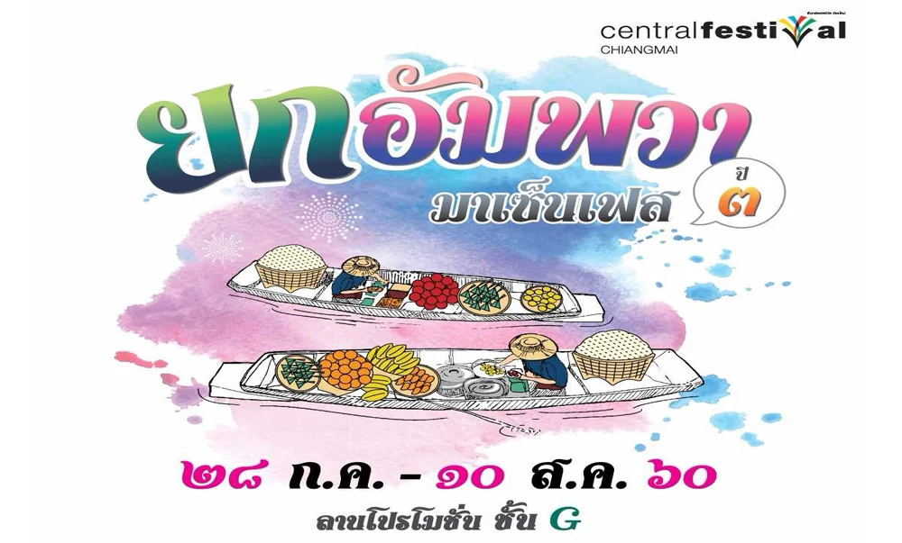 ศูนย์การค้าเซ็นทรัลเฟสติวัล เชียงใหม่ ชวนพบการจำลองตลาดน้ำภายในศูนย์การค้าฯในปีนี้เป็นปีที่ 2 ภายใต้กระแสตอบรับอย่างล้นหลาม ในงานให้คุณได้สัมผัสวัฒนธรรม และวิถีพื้นบ้านฉบับชาวอัมพวาแบบต้นตำรับ คัดสรรร้านค้าชื่อดังมาให้ชาวเชียงใหม่ได้สัมผัสถึงที่ อาทิ ขนมหม้อแกงหม้อดิน, กาแฟโบราณอัมพวา, ส้มตำครกหิน, ปลื้มจิตรหอยจ๊อโบราณ, ยายติ๋วหมี่กรอบ, ปลาทูแม่กลอง, น้ำพริกไข่ปู ปูหลน ยำปู , บะจ่างแม่กิมลั้ง, ผัดไทยโบราณกุ้งแม่น้ำ ร่วมด้วยการตกแต่งบรรยากาศของงานด้วยบ้านทรงไทยและเรือโบราณ พร้อมการขับกล่อมผู้มาร่วมงานด้วยดนตรีสุดคลาสสิค
