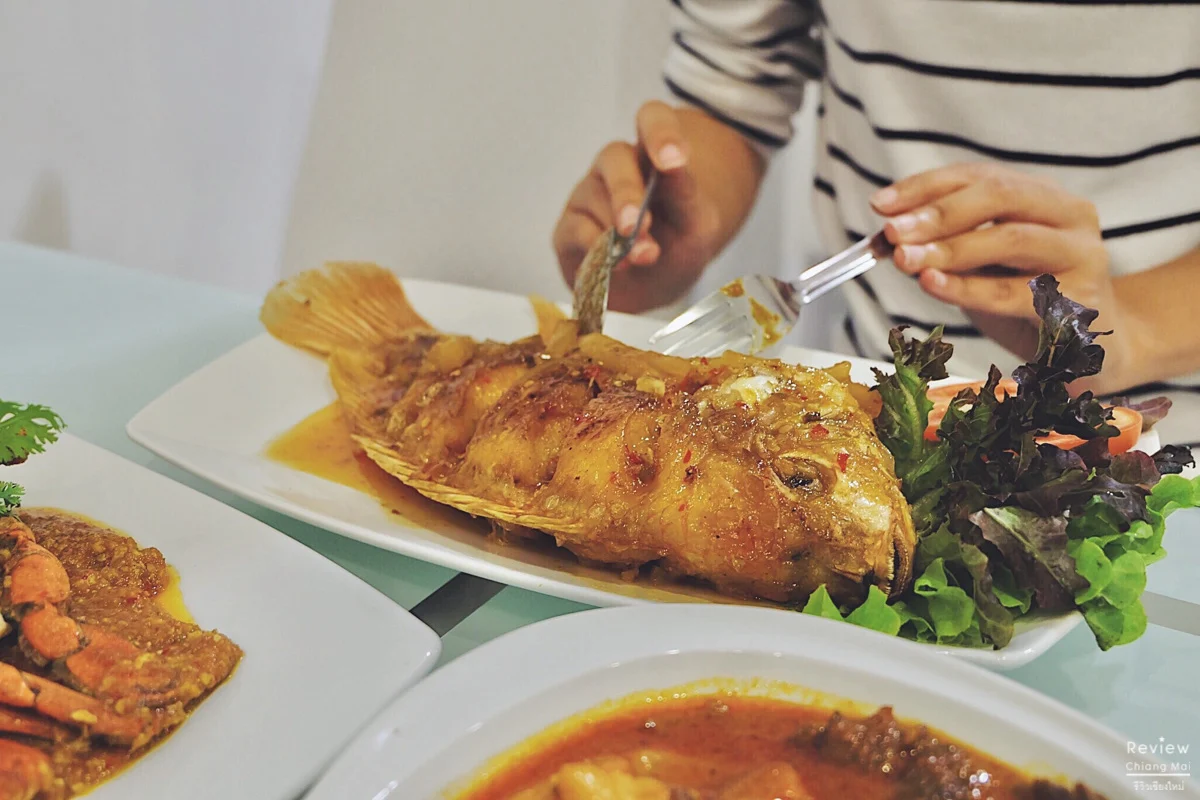 จานนี้เป็นปลาทับทิมทอดซอสสามรส เมนูฟิวชั่น ผสมผสานสไตล์ไทยกับสไตล์สิงคโปร์เข้าด้วยกัน ไม่เผ็ดมากครับ เปรี้ยว หวาน รสชาติกำลังพอดีเลย ปลาสด เนื้อกรอบนอกจากการทอด แต่เนื้อด้านในแน่นเพราะความสดของปลาครับ