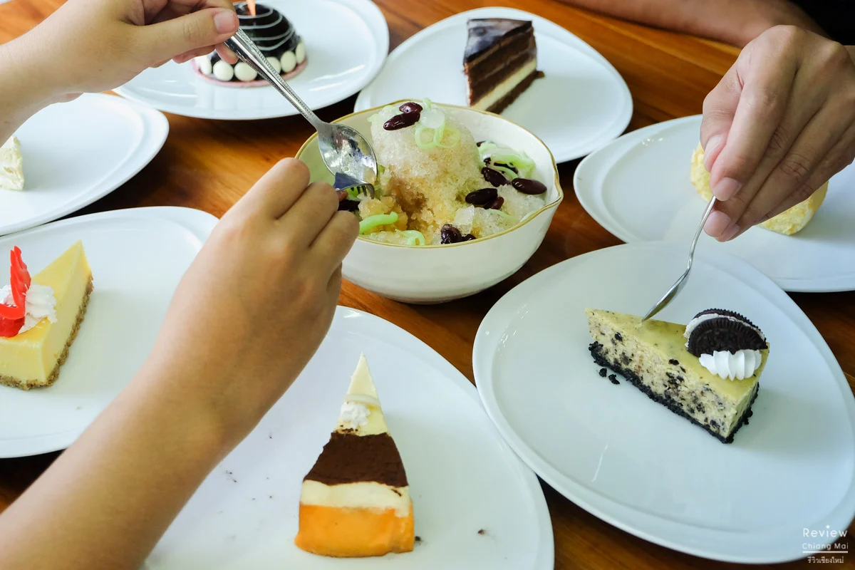 ได้เวลาหม่ำๆ เค้กกันแล้ว เริ่มกันที่ Oreo Cheesecake ที่มีส่วนผสมของเนื้อโอริโอ้บดละเอียด เข้ากับชีสเค้กได้ดี ลำดับต่อมา Tiramisu เค้กกาแฟยอดนิยม ชุ่มฉ่ำ นุ่มลิ้น รสกาแฟไม่ขมมาก อร่อยลงตัว ต่อมาเป็น New York Cheesecake ตัว Signature ของ Ocean Blue เค้าเหละ ชีสเน้นๆ กว่า 90% ชีสเนีนยนุ่มเต็มปากเต็มคำ คอชีสเค้กห้ามพลาด ! ต่อมาเป็นเค้ก Belgium Mousse ลักษณะแปลกตา ทรงครึ่งวงกลม ด้านในเป็นช็อคโกแลตเบลเยี่ยมแท้ เนื้อมูสเข้มข้น และปิดท้ายกันด้วย Chocolate Moose Cake เค้กนุ่ม เนื้อไม่แน่น เด้งดึ๋งๆ ออกแนวฉ่ำๆ ตักเข้าปากแล้วละลายรสช็อคโกแลตออกมา ถือว่าเค้กแต่ละชนิดเป็นความอร่อยที่ลงตัว เป็นของว่าหลังจากทานของคาวมื้อหนักได้ดีทีเดียว