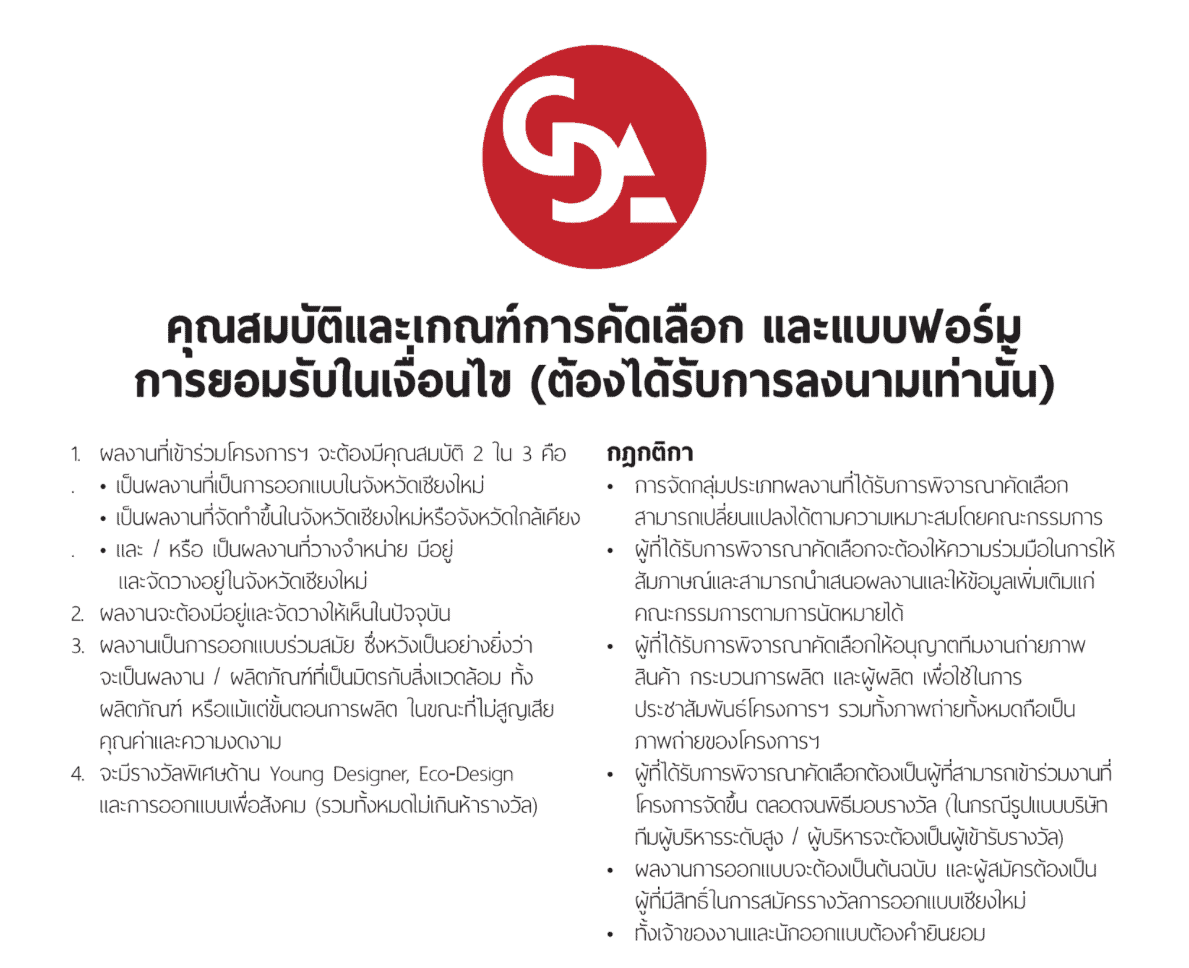 แล้วจะไปเอารางวัลมาจากไหน นี่ไง chiangmai design awards เวทีที่เปิดกว้างสำหรับคนทุกเพศทุกวัยที่ให้โอกาสเราแสดงความสามารถ และปล่อยของอย่างเต็มที่ ทั้งงานออกแบบ และศิลปะกว่า 7 จะสาขาซึ่งเป็นรางวัลในระดับประเทศ ที่จะให้คุณได้เชิดฉายในสายอาชีพ และต่อยอดในทางธุรกิจ กับผู้ประกอบการชั้นนำ ผ่านงานออกแบบ