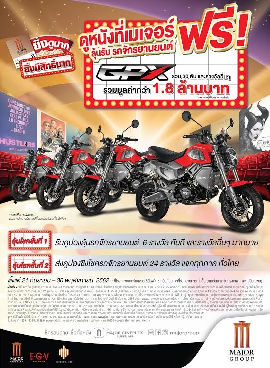 ลุ้นโชคชั้นที่1 รับคูปองลุ้นรถจักรยานยนต์ GPX รุ่น Demon X125 6 รางวัล // ลุ้นโชคชั้นที่ 2 >>>บัตรชมภาพยนตร์ในเครือเมเจอร์ ซีนีเพล็กซ์ กรุ้ป และรางวัลอื่น