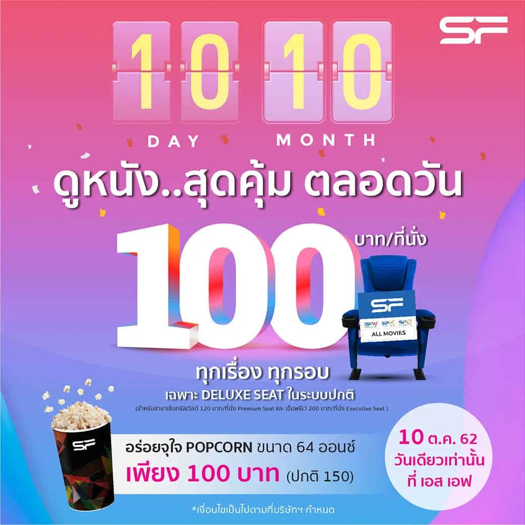 สุดเซอร์ไพรส์!! วันที่ 10 เดือน10 เจอกันที่ เอส เอฟ ซื้อตั๋วหนังเริ่มต้น 100 บาท!! ทุกเรื่อง ทุกรอบ ในระบบปกติ ซื้อป๊อปคอร์น ขนาด 64 ออนซ์ ราคาพิเศษ 100 บาท!!