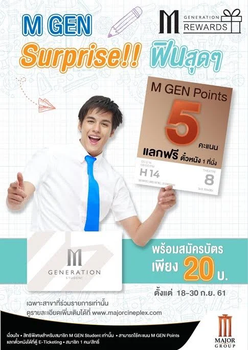 โปรโมชั่น สมาชิก M Gen Student รับสิทธิ์ใช้เพียง 5 คะแนน แลกตั๋วหนังฟรี 1 ที่นั่ง