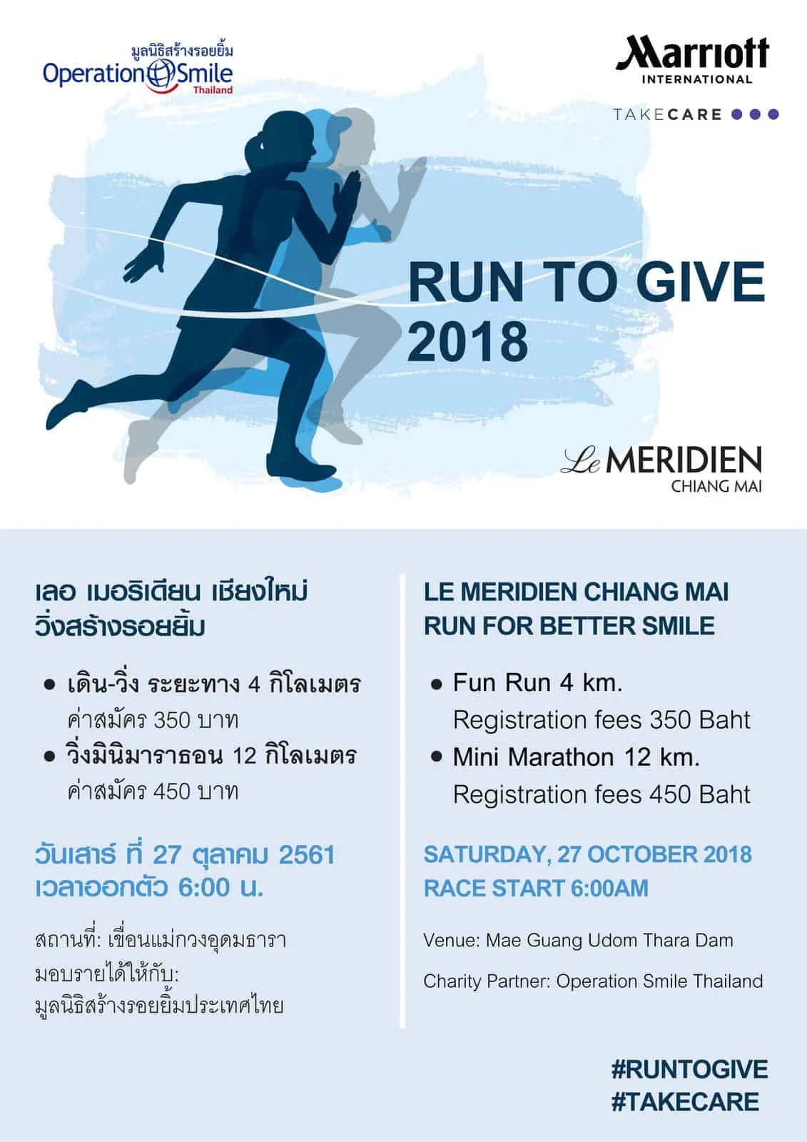 งานวิ่งการกุศลประจำปี Run to Give ครั้งที่ 5 วันเสาร์ที่ 27 ตุลาคม 2561 ที่จะจัดขึ้นที่เขื่อนแม่กวงอุดมธารา อ.ดอยสะเก็ด จ.เชียงใหม่