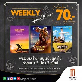 โปรโมชั่นชมภาพยนตร์ราคาพิเศษ 70 บาท เรื่อง BOHEMIAN ,BUMBLEBEE และ ขุนบันลือราคาพิเศษ เริ่มต้นเพียง 70 บาท ตั้งแต่วันที่ 24 มกราคม2562 – ตลอดโปรแกรมฉาย นี้ รายละเอียดเพิ่มเติม www.majorcineplex.com