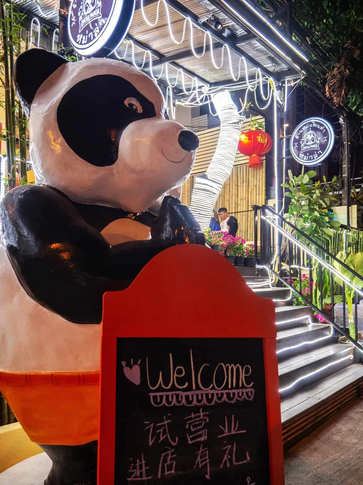 ร้านติดไฟสว่างไสว มีเจ้าตุ๊กตาแพนด้าตัวใหญ่ยืนต้อนรับ