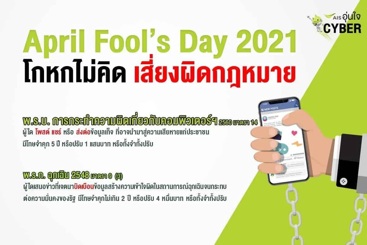 AIS อุ่นใจCyber ที่ให้ความสำคัญกับการส่งเสริมการใช้ออนไลน์อย่างถูกวิธี ในฐานะเพื่อนคู่คิดดิจิทัลของคนไทย จึงขอเป็นอีกหนึ่งพลังสำคัญร่วมเตือนคนไทยให้ใช้ออนไลน์อย่างมีสติ ไม่นำเข้าข้อมูลอันเป็นเท็จที่อาจจะก่อให้เกิดความเข้าใจผิด พร้อมกับเช็คข้อมูลให้ชัวร์ก่อนส่งต่อเสมอ โดยเฉพาะอย่างยิ่งในวันที่ 1 เมษายน เพราะไม่เช่นนั้นอาจเกิดความผิดฐานนำเข้าสู่ระบบคอมพิวเตอร์ซึ่งข้อมูลคอมพิวเตอร์อันเป็นเท็จ ตาม “พ.ร.บ.คอมพิวเตอร์ มาตรา 14 ปี 2560” ว่าด้วยการกระทำความผิดเกี่ยวกับคอมพิวเตอร์ฯ