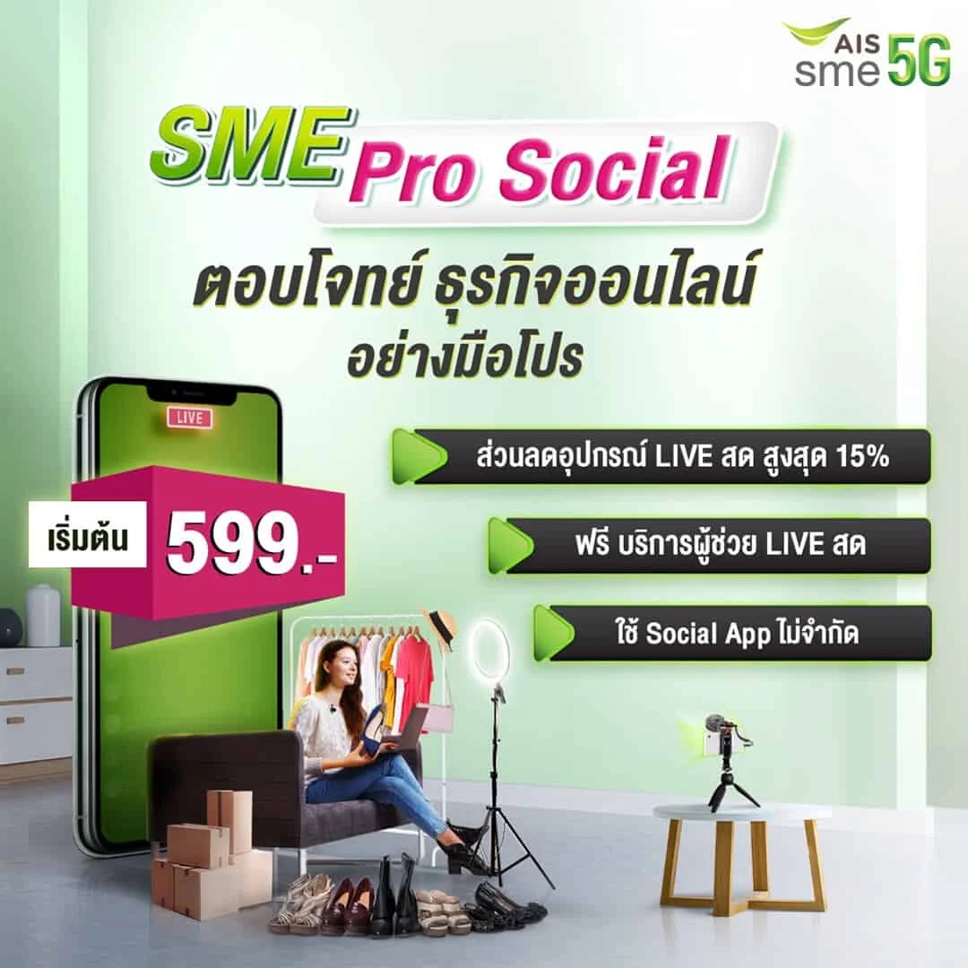 ครบเครื่องทุกรูปแบบการสื่อสารที่ออกแบบมาแล้วว่าเหมาะกับธุรกิจออนไลน์ อาทิ SME Pro Social ให้เป็นนักธุรกิจออนไลน์แบบมือโปร เริ่มต้นเพียง เดือนละ 599 บาท สุดคุ้ม ทั้งโทรและเน็ต พร้อมใช้ฟรีบริการผู้ช่วย LIVE สด, รับฟรีส่วนลดอุปกรณ์ LIVE สด เบื้องต้นแบบครบเซ็ต, ใช้ฟรี Social App. (Facebook, Instagram, LINE และ What App) พร้อมฟรีประกันภัยไซเบอร์ ลดความเสี่ยงที่ธุรกิจจะเสียหายจากการโจมตีทางไซเบอร์ในยุคนี้ นอกจากนี้ ยังมอบความพิเศษให้กับลูกค้าที่เปิดเบอร์ หรือย้ายค่าย ได้คุ้มเต็มแรง 3 ต่อ คุ้มที่หนึ่ง รับอินเทอร์เน็ต 5G จำนวน 10 GB/เดือน นาน 3 เดือน เพื่อใช้ติดต่อสื่อสารช่วงวิกฤตโควิด คุ้มที่สอง รับสิทธิ์สินเชื่อจากธนาคาร UOB อัตราดอกเบี้ยพิเศษ และคุ้มที่สาม รับส่วนลดสูงสุดถึง 30% ในการซื้อ Tablet หรือ Smartphone (เฉพาะรุ่นที่ร่วมรายการ) จาก Samsung