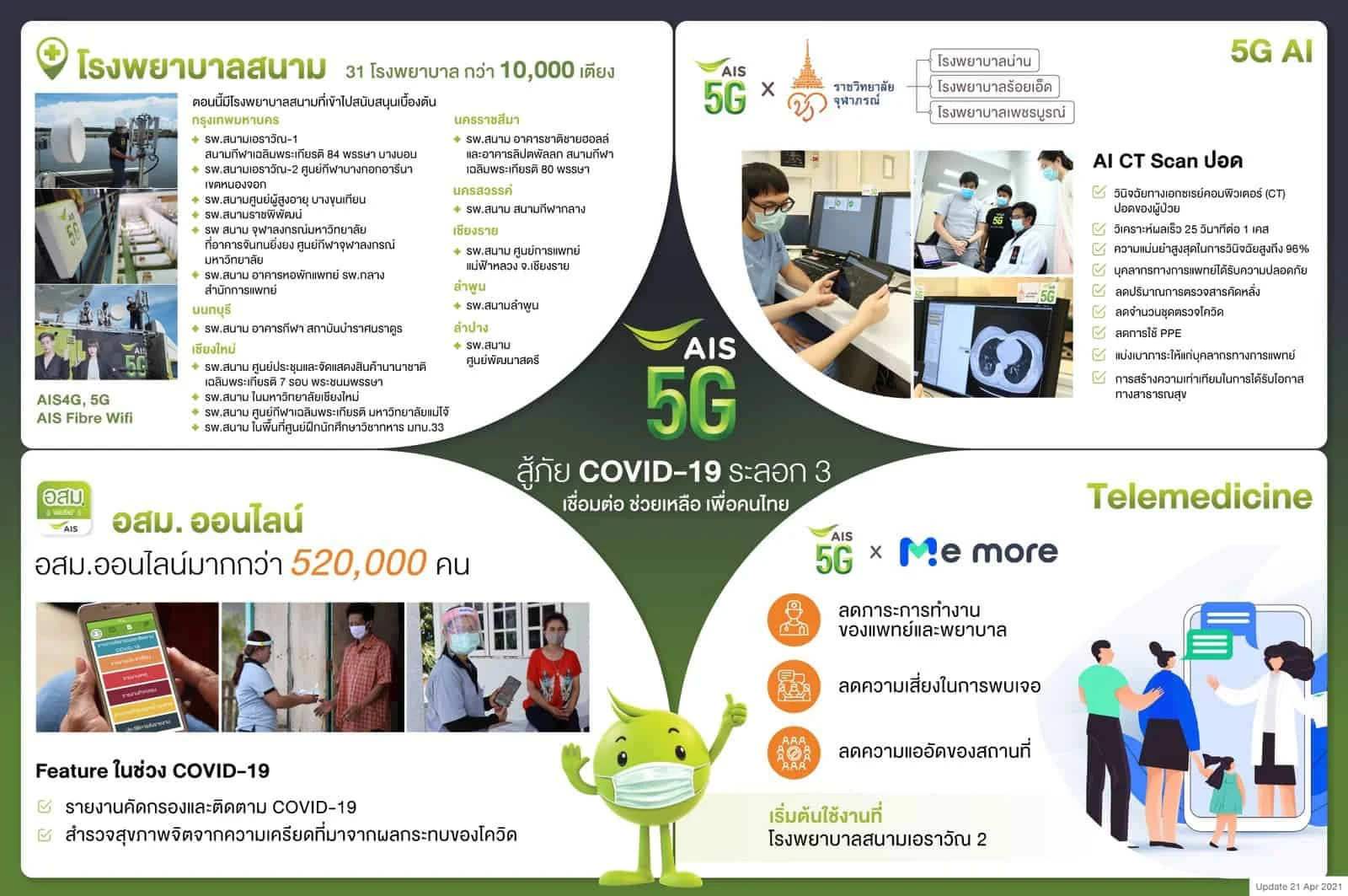● โรงพยาบาลสนาม ติดตั้งเครือข่าย AIS 5G ,4G, Free Wifi ในโรงพยาบาลสนามหลักกว่า 31 แห่ง มากกว่า 10,000 เตียง ทั่วประเทศ เพื่อให้บุคลากรทางการแพทย์ทำงานได้อย่างเต็มประสิทธิภาพ เช่น เชื่อมต่อระบบ CCTV เพื่อเฝ้าระวังผู้ป่วย, การส่งต่อข้อมูลการแพทย์ ตลอดจนให้ผู้ป่วยที่กักตัวสามารถสื่อสาร ติดตามข่าวคราวความเคลื่อนไหวให้คลายความกังวล มีกำลังใจในการฟื้นฟูสุขภาพ